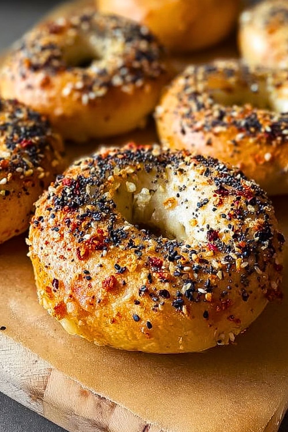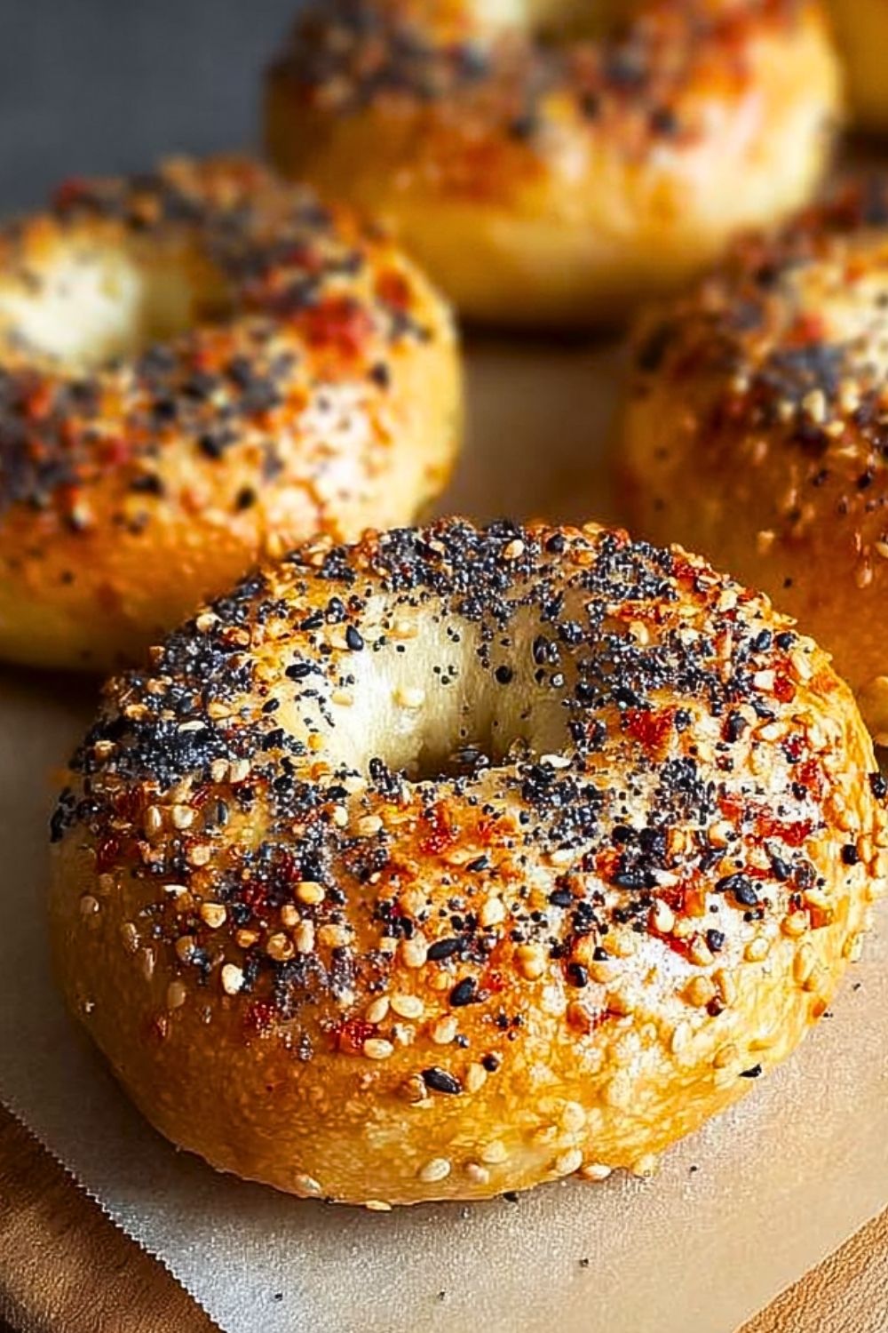 After boiling, place the bagels back on the tray. While still wet, sprinkle them generously with your chosen toppings — everything seasoning is the classic go-to.
