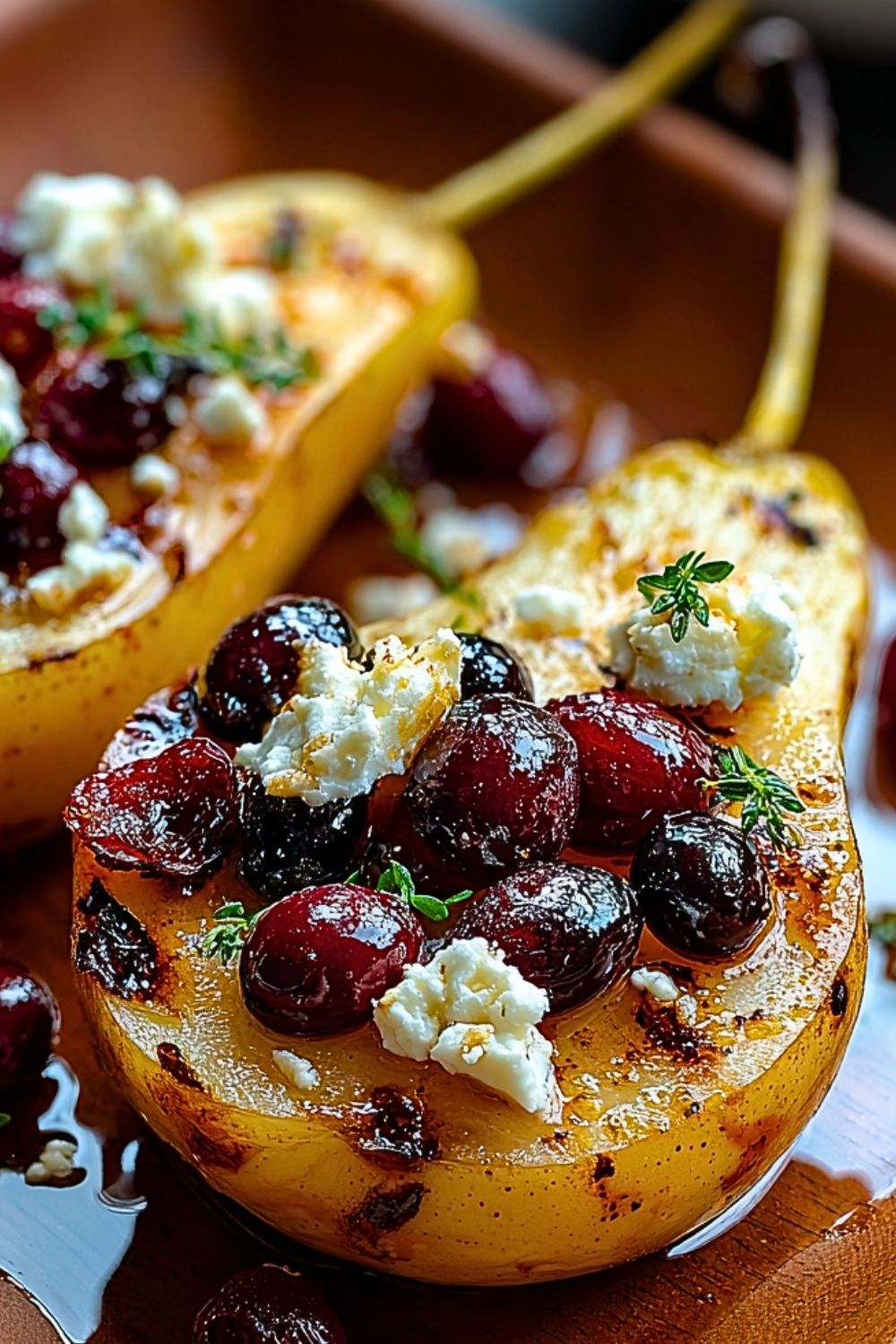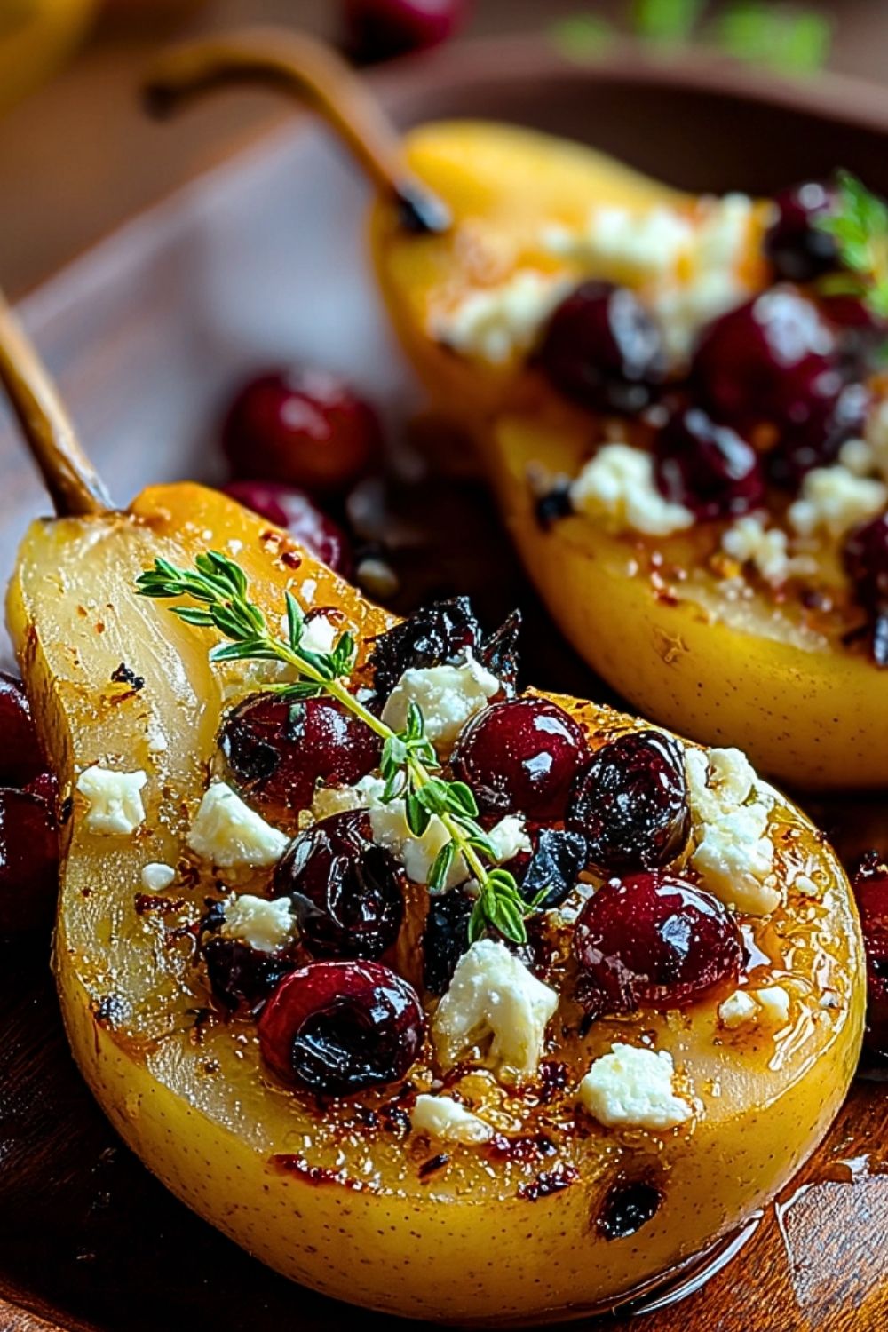 Return the pears to the oven and bake for an additional 10–15 minutes. During this time, the feta will soften slightly, the cranberries will plump, and the honey will caramelize.