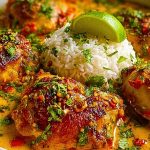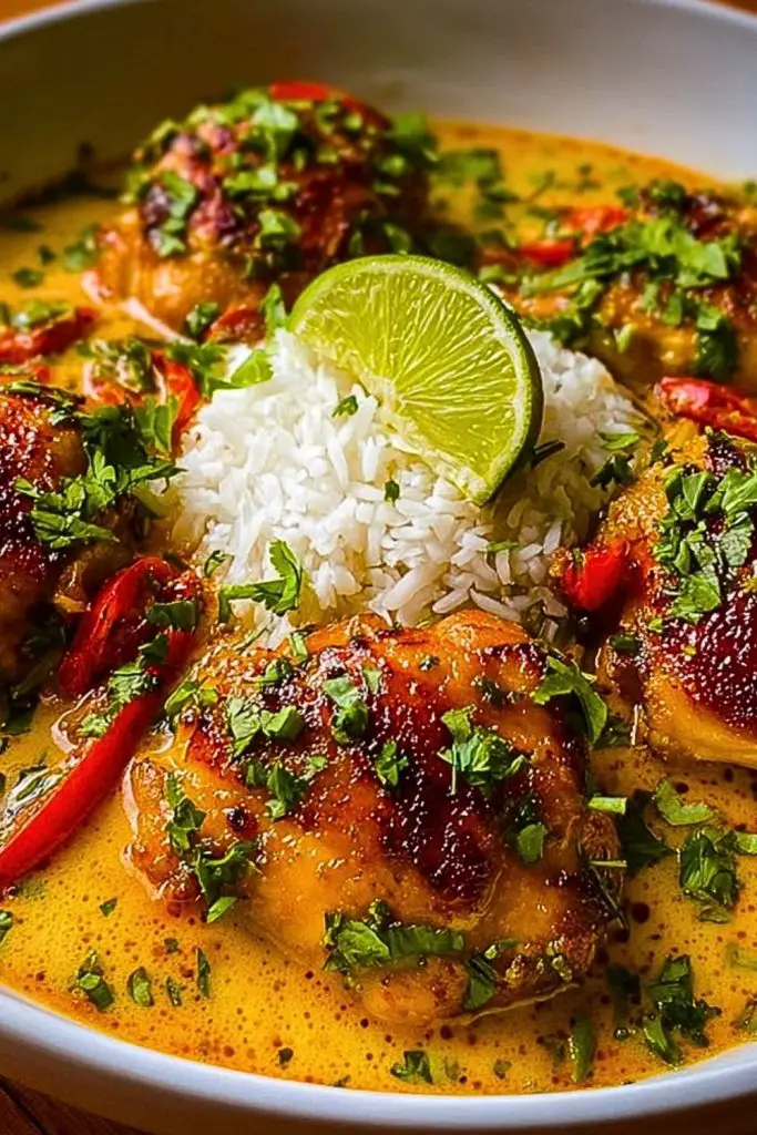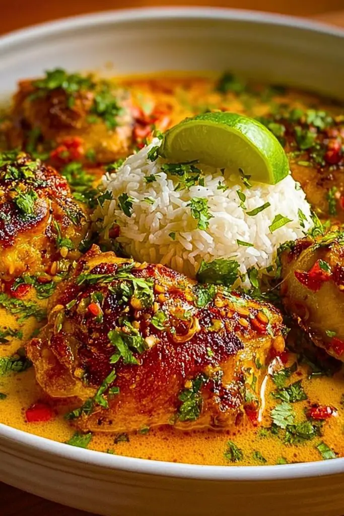 Spoon the chicken and sauce over a bed of steamed rice or your favorite side. Garnish with extra lime wedges and a final touch of herbs for a vibrant, fragrant finish.