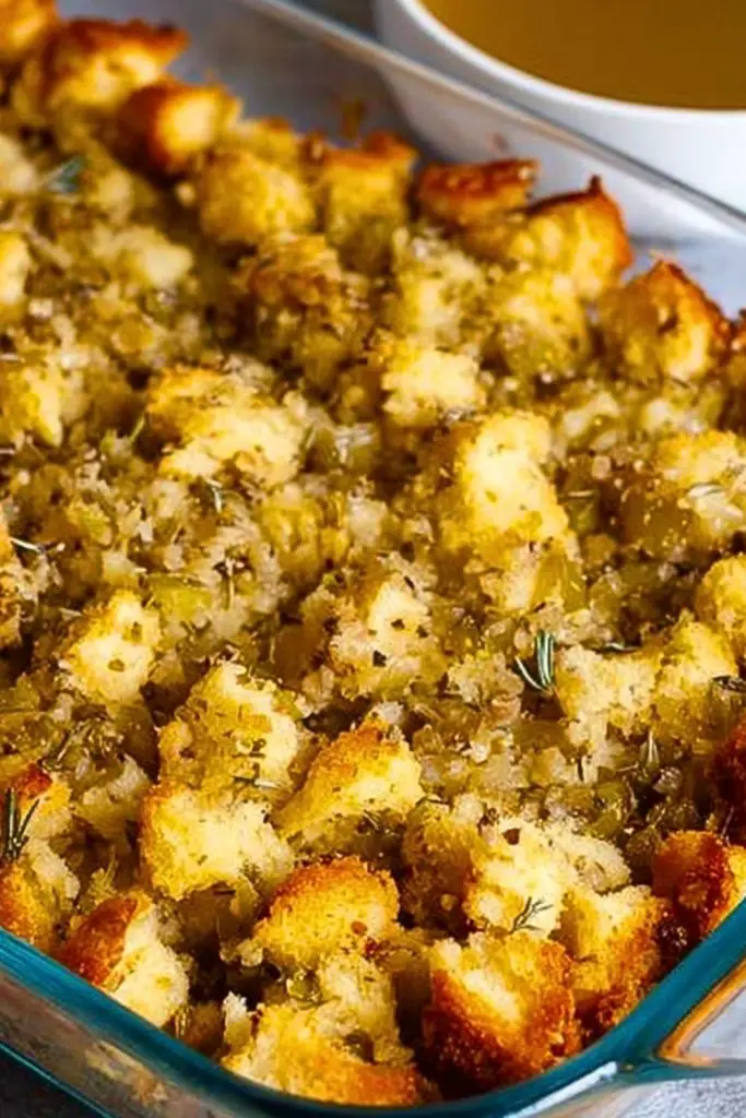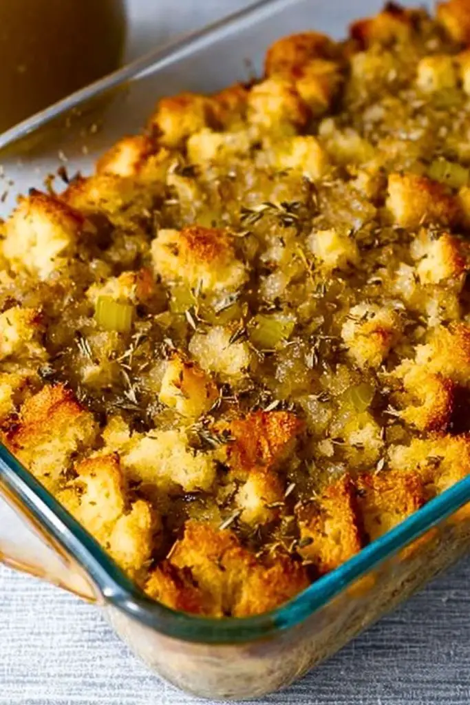 Use day-old or oven-dried bread cubes to prevent sogginess. When sautéing your vegetables, let them get soft and aromatic—don’t rush this step. Taste your broth before combining to ensure it’s well-seasoned. When mixing everything together, do it gently to keep some of the bread cubes intact for texture. And finally, don’t skip the rest period after baking; letting the dressing sit for a few minutes before serving helps all the flavors settle beautifully.