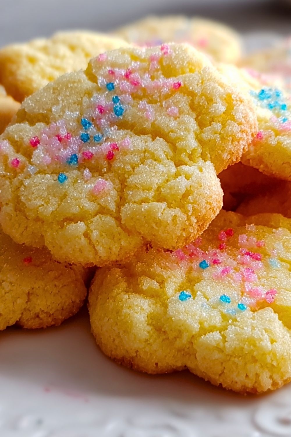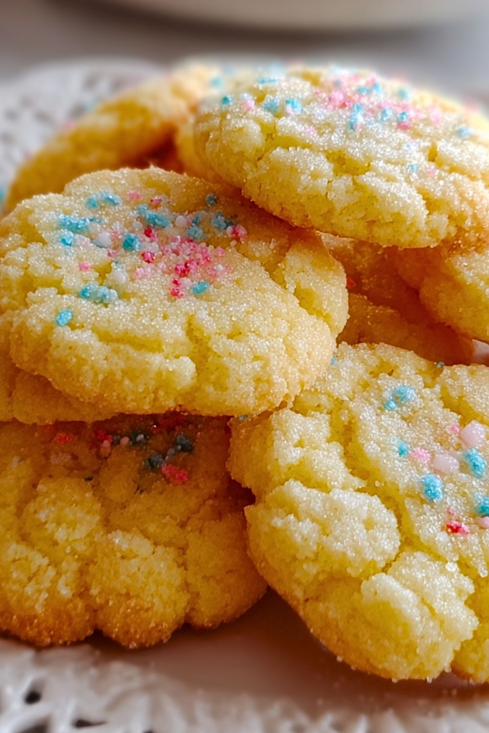 Scoop small portions of dough and roll them into balls. Then roll each ball in granulated sugar (and sprinkles if using) to coat evenly.