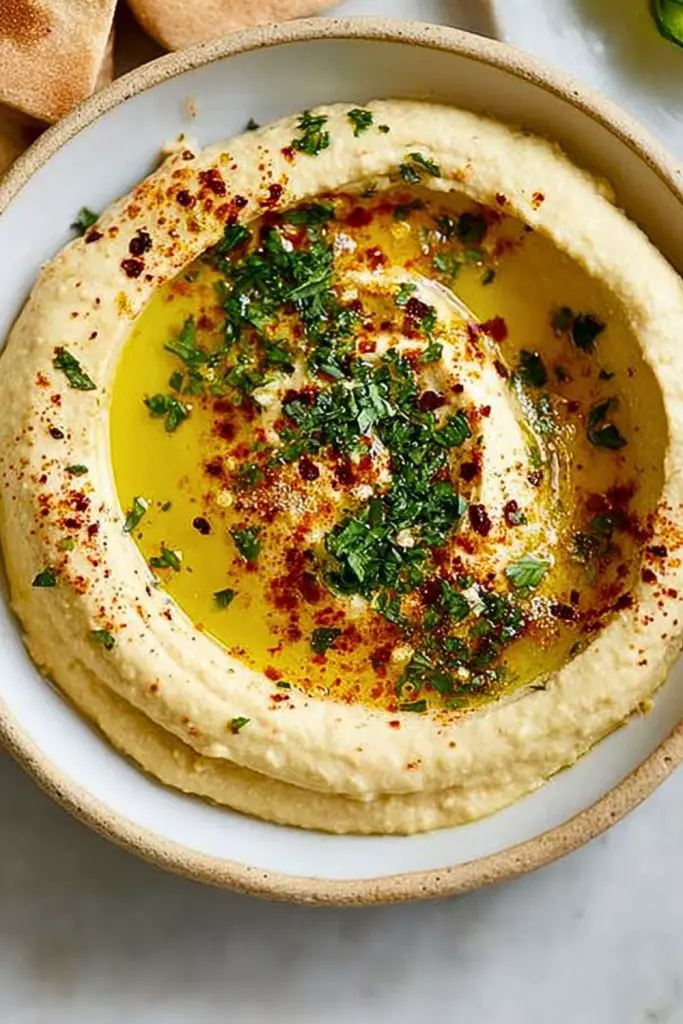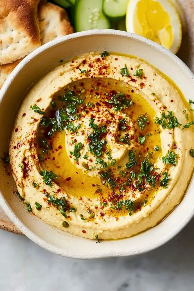 Made with just a few wholesome ingredients like chickpeas, tahini, lemon juice, and garlic, this smooth and fluffy hummus comes together effortlessly. With a drizzle of olive oil, a sprinkle of paprika, and a touch of fresh parsley, it looks as beautiful as it tastes. Once you master this recipe, you’ll never want to go back to store-bought again.