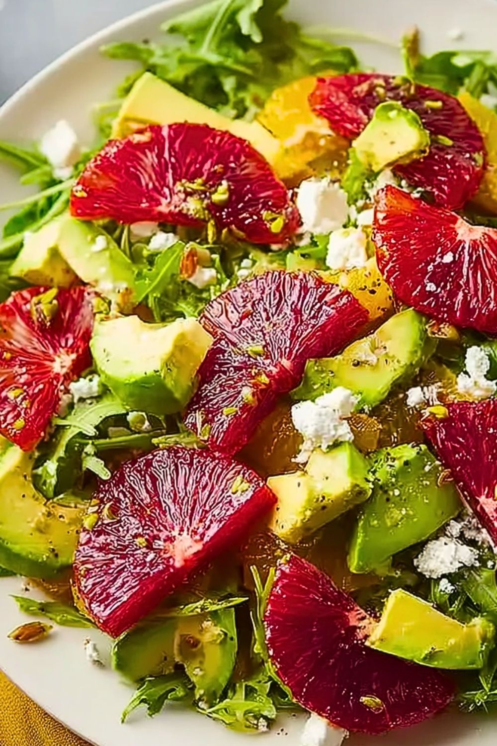 If blood oranges aren’t in season, Cara Cara oranges or even ruby red grapefruit work well. Don’t have feta? Goat cheese or crumbled ricotta salata are great stand-ins. You can swap pistachios for toasted almonds or walnuts if you prefer a different crunch. And while arugula gives a nice peppery edge, mixed greens or baby spinach will also work beautifully.