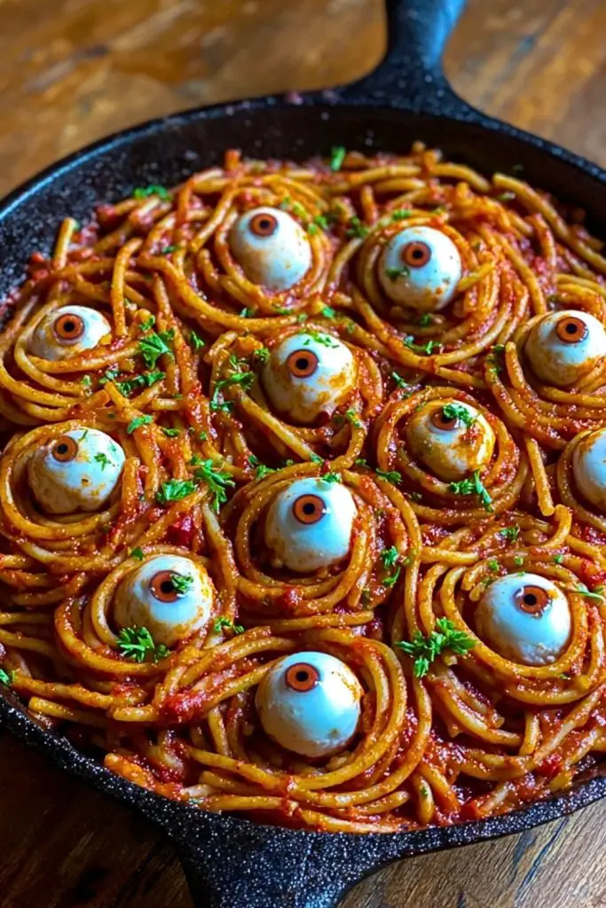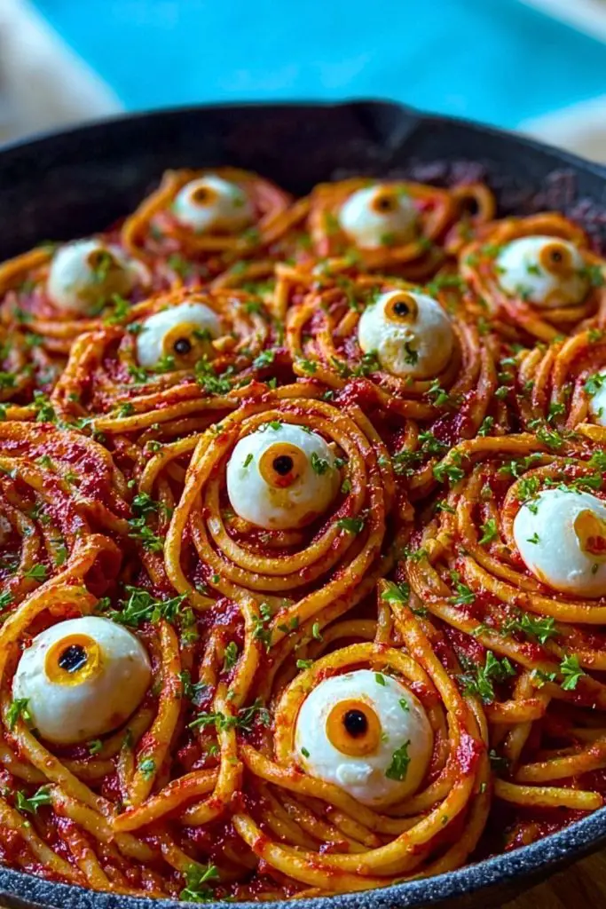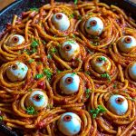 This recipe is more than just a visual gag, though — it’s seriously tasty. The rich tomato sauce is seasoned with garlic, herbs, and a touch of chili for heat, while the spaghetti offers comfort in every twirl. It’s a fun and festive meal that comes together easily, making it ideal for Halloween parties or family dinners during spooky season. Trust me, once you serve this, it’ll become a tradition.