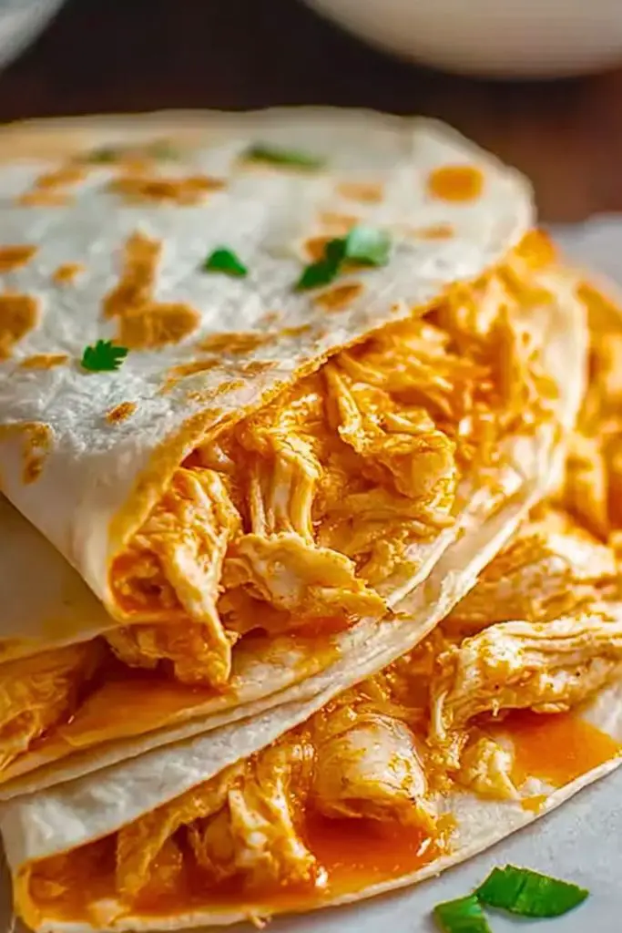 Once cooked, remove the quesadilla from the pan and let it rest for 1 minute. Slice into wedges using a sharp knife or pizza cutter. Garnish with chopped cilantro or green onions if desired. Serve hot with extra Buffalo sauce, ranch, or blue cheese dressing for dipping.