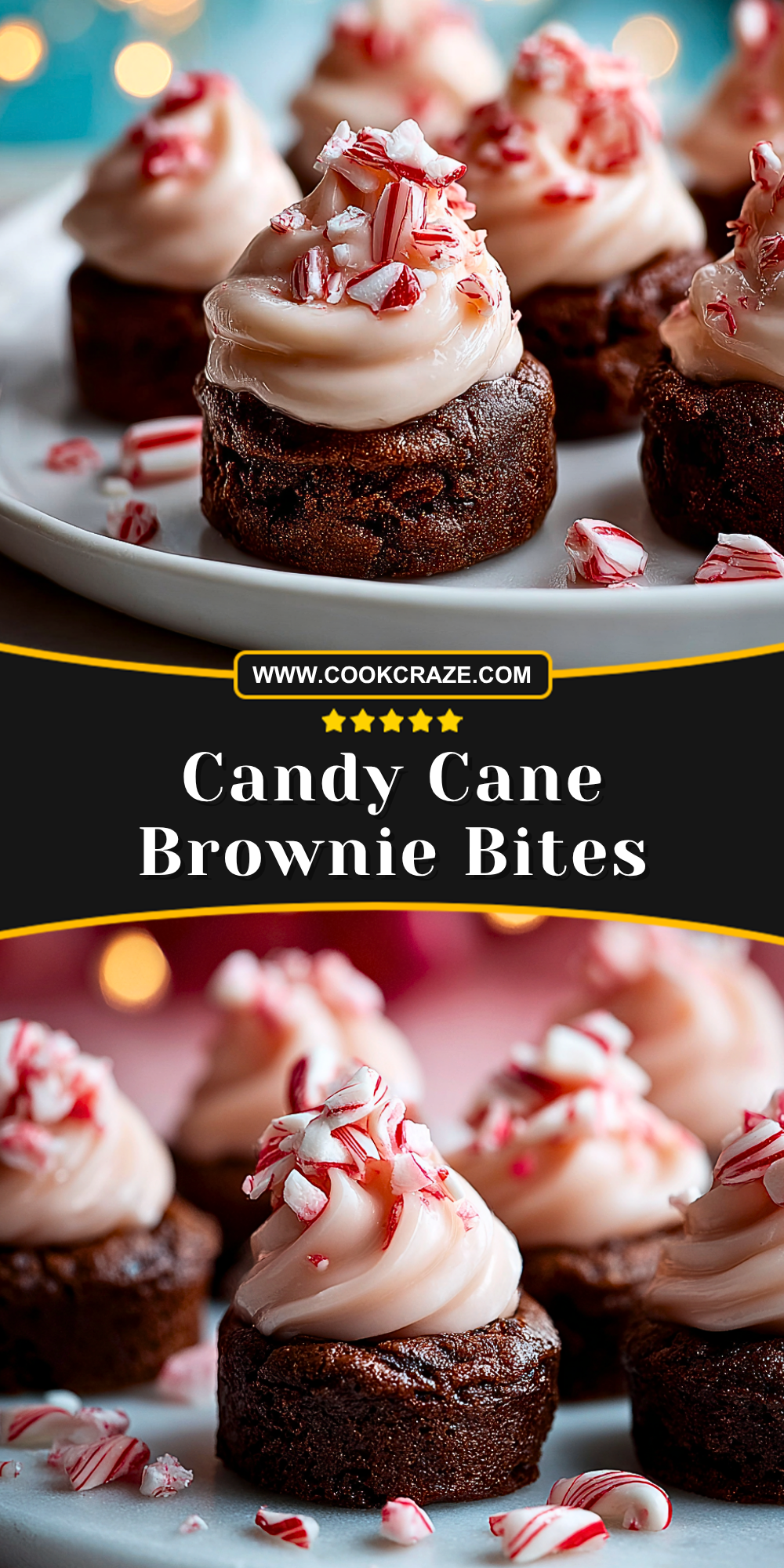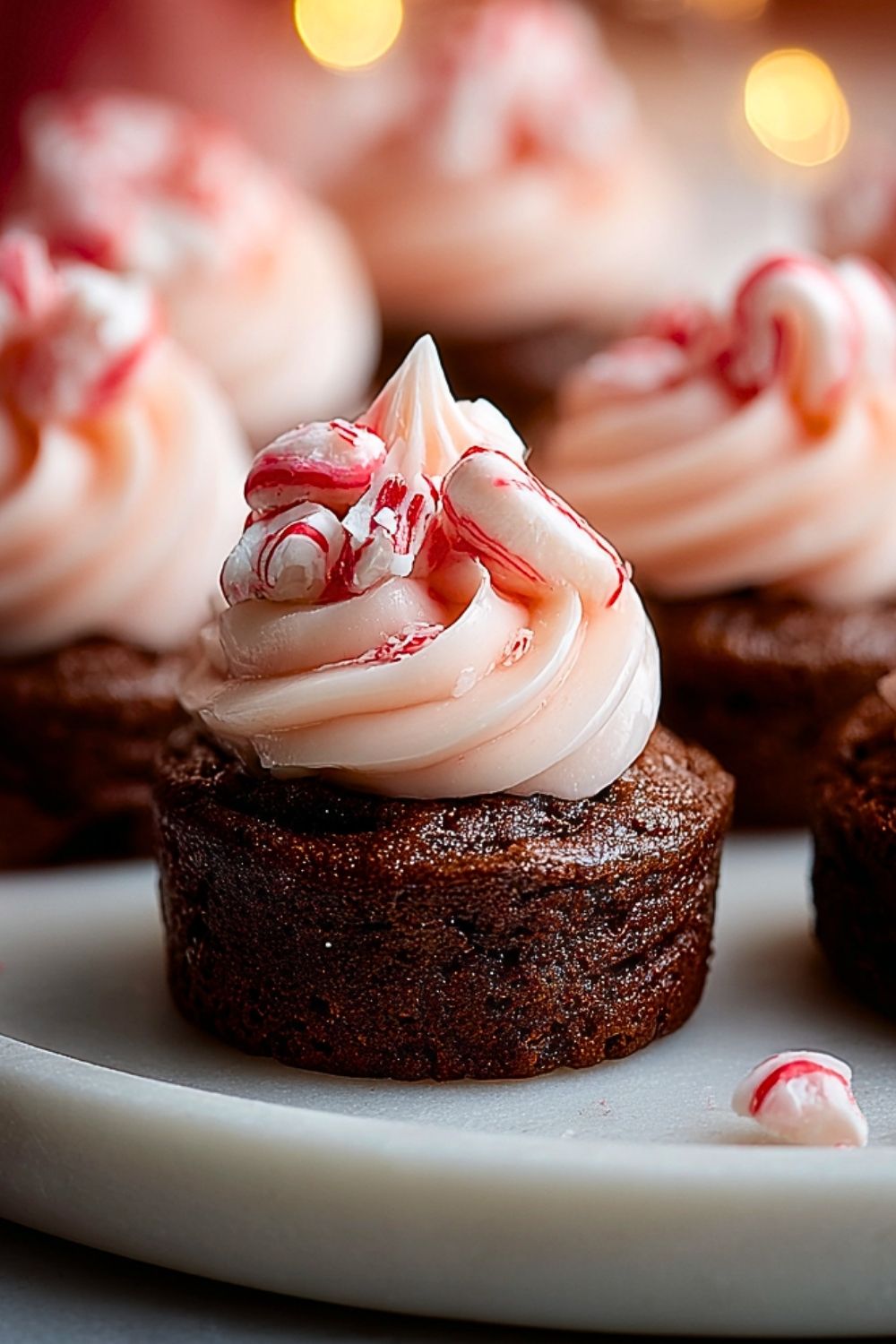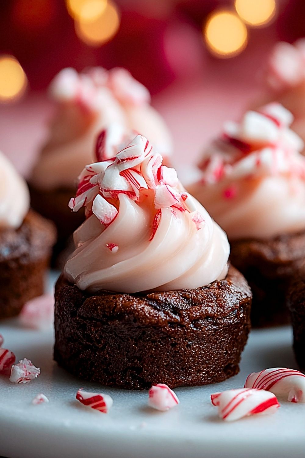 Sprinkle crushed candy canes over the frosting immediately so they stick. Add a mini candy cane on top of each brownie bite for an extra festive look. Serve fresh or refrigerate until needed.