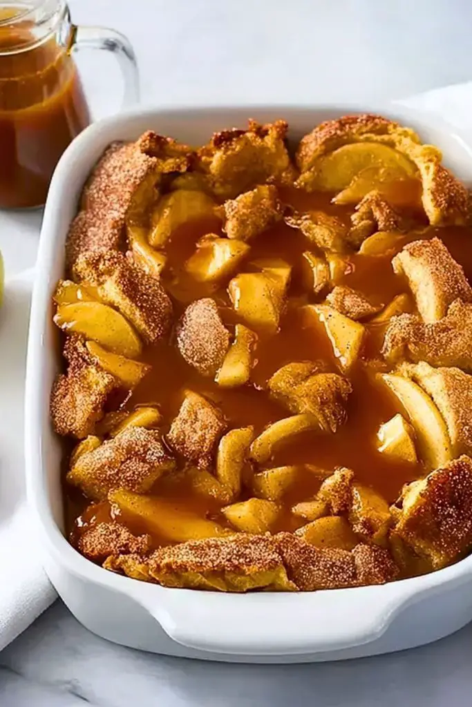 4. Grease a 9×13 baking dish. Layer half the bread, half the apples, and drizzle some caramel sauce. Repeat with the remaining bread and apples.