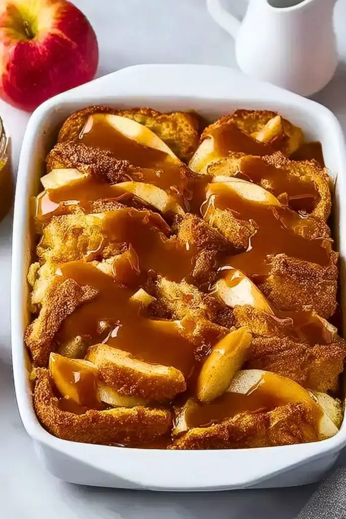 Grease a 9×13 inch baking dish. Add half the bread cubes, followed by half the chopped apples. Drizzle some caramel sauce over this layer. Add the remaining bread and apples on top, then pour the custard mixture evenly over everything, pressing down gently so all the bread gets soaked.