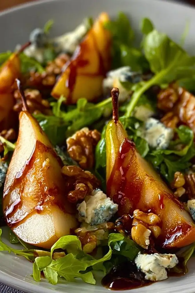 Finish the salad with a generous drizzle of balsamic glaze. Serve immediately while the pears are still slightly warm and the blue cheese is at room temperature for optimal flavor and texture.