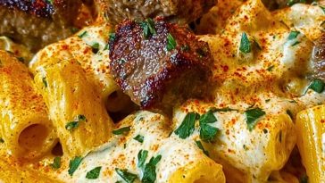 • Cajun Garlic Butter Linguine with Tender Beef Strips Rigatoni