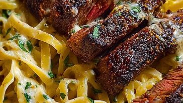 • Cajun Garlic Butter Steak over Creamy Parmesan Linguine