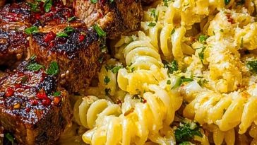 • Steak Bites and Cheesy Rotini in Garlic Parmesan Sauce