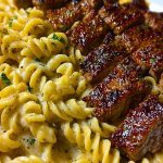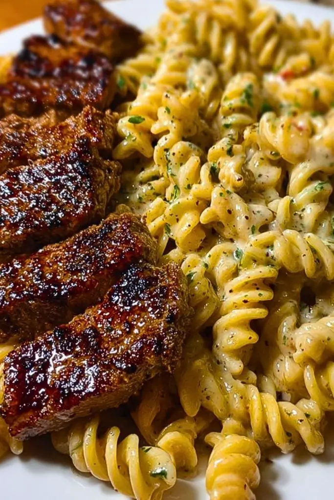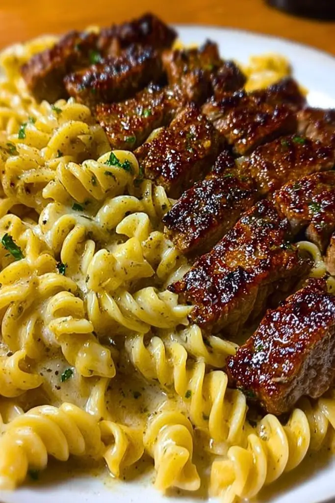 Perfect for weeknight dinners or impressing guests, this meal feels indulgent yet comes together with surprising ease. It’s one of those “wow” dishes you’ll want to put on repeat — satisfying, full of texture, and layered with flavor from the seared steak juices blending into the creamy sauce. The pasta holds onto that luscious garlic-parmesan coating, creating a harmony that’s bold, creamy, and deeply savory.