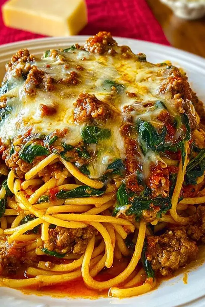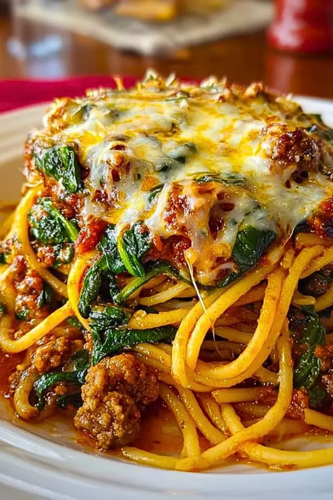 The magic lies in the way everything comes together: garlicky butter coating every strand of spaghetti, tender crumbles of spicy Italian sausage, wilted spinach that brings a touch of green and freshness, and that final shower of melted cheese that ties it all together. The sauce is silky and indulgent, clinging to the pasta in the best possible way. You’ll want to grab a fork, twirl up a big bite, and dive right in.