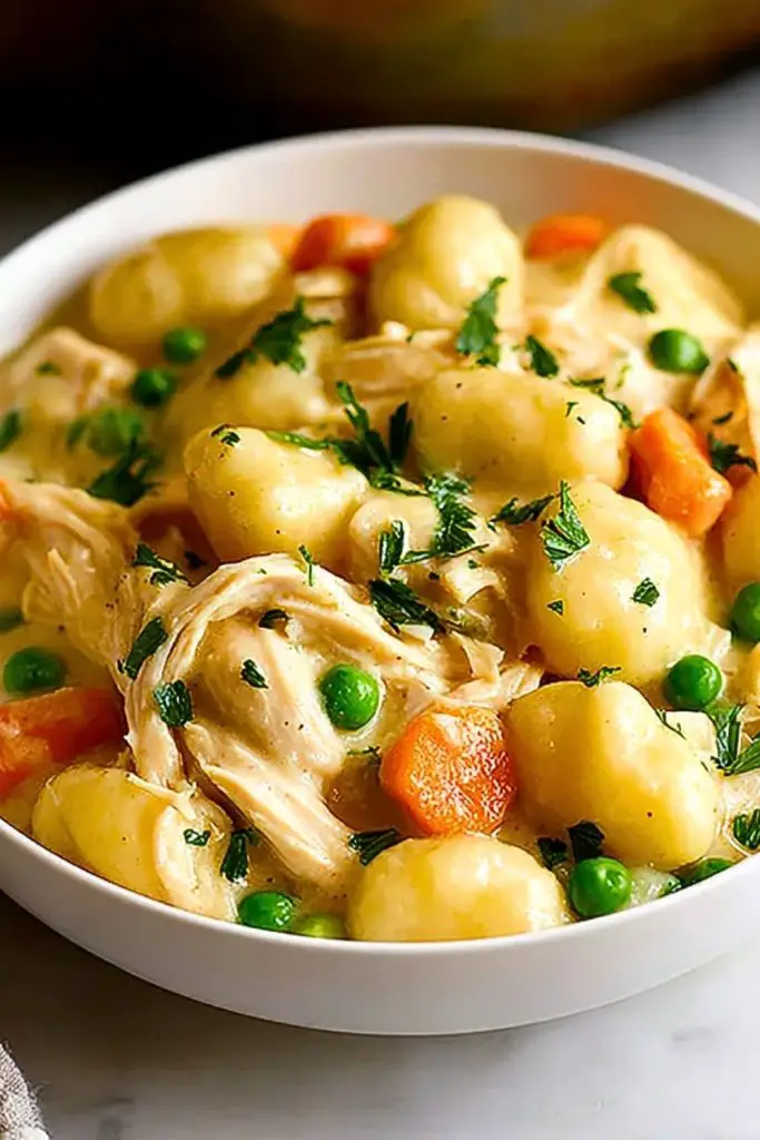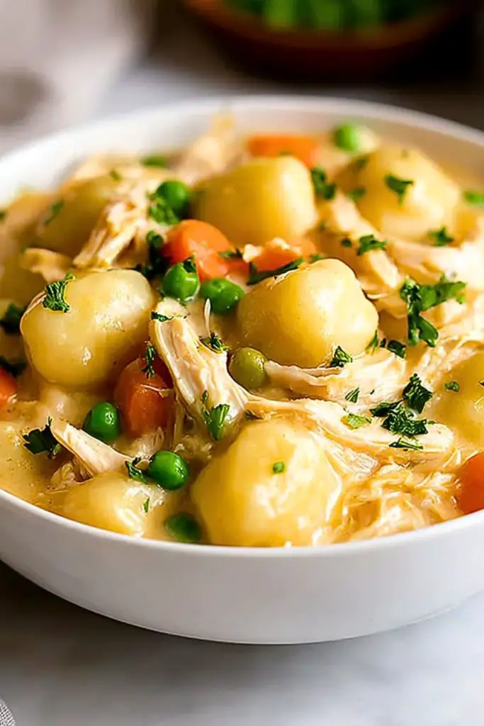 Creamy, hearty, and loaded with comfort — this Classic Chicken and Dumplings with Gnocchi is the ultimate quick dinner solution. With tender shredded chicken, pillowy gnocchi, sweet peas, and carrots in a velvety herb-infused sauce, this dish offers everything you want from cozy food ideas. Perfect for anyone craving an easy dinner, family-friendly meals, or comforting weeknight dinner ideas. Whether you’re looking for a healthy-ish snack, quick meal prep, or easy recipe for leftover chicken, this one-pot wonder delivers in taste and simplicity.