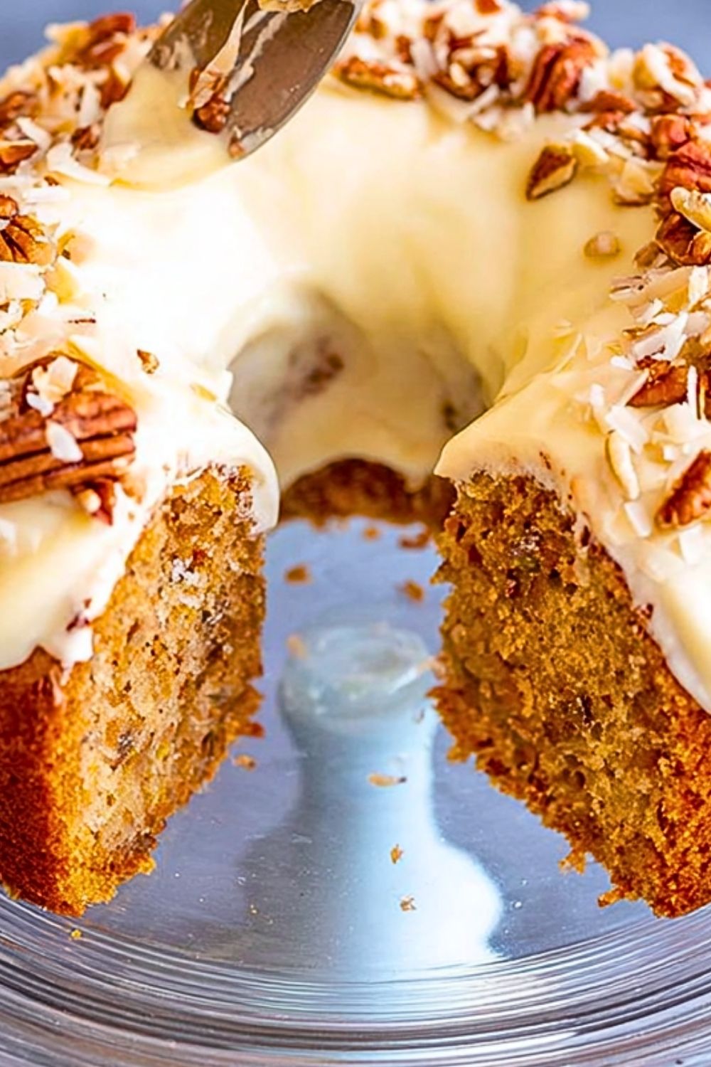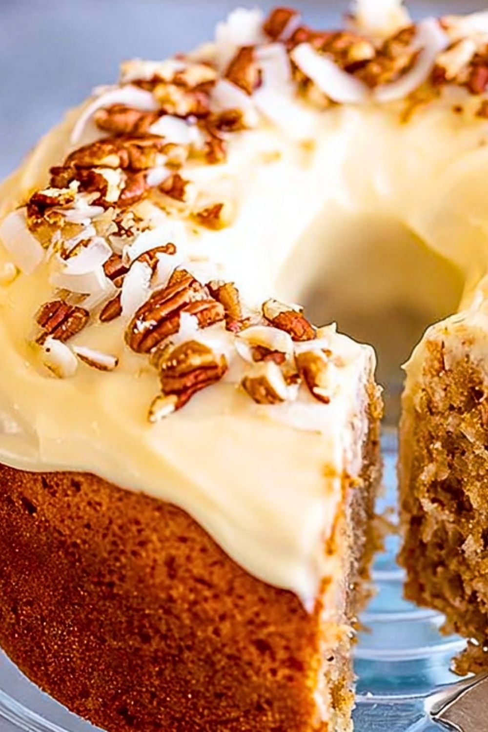 8. Once cake is fully cool, frost generously. Top with extra pecans or coconut if desired.