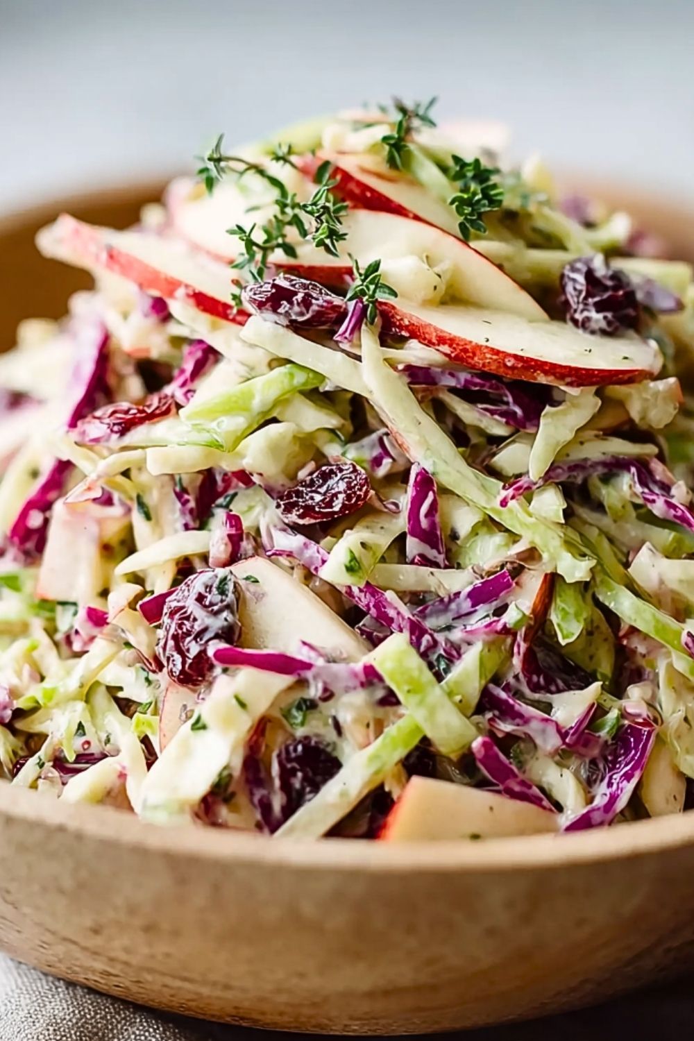 Use a mix of green and red cabbage for a beautiful color contrast and depth of flavor. Always slice the cabbage thinly to keep the texture light rather than bulky. Choose crisp, sweet apples like Honeycrisp or Fuji that won’t brown quickly and hold their crunch. Toss the dressing with the cabbage mixture just before serving to retain freshness and avoid sogginess. If you want to make it ahead, keep the dressing and slaw separate until ready to serve.
