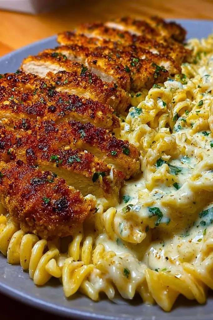 - Reheating: Warm the pasta in a skillet over low heat with a splash of milk or cream to loosen the sauce. Reheat the chicken in the oven or air fryer at 350°F until heated through and crispy again.