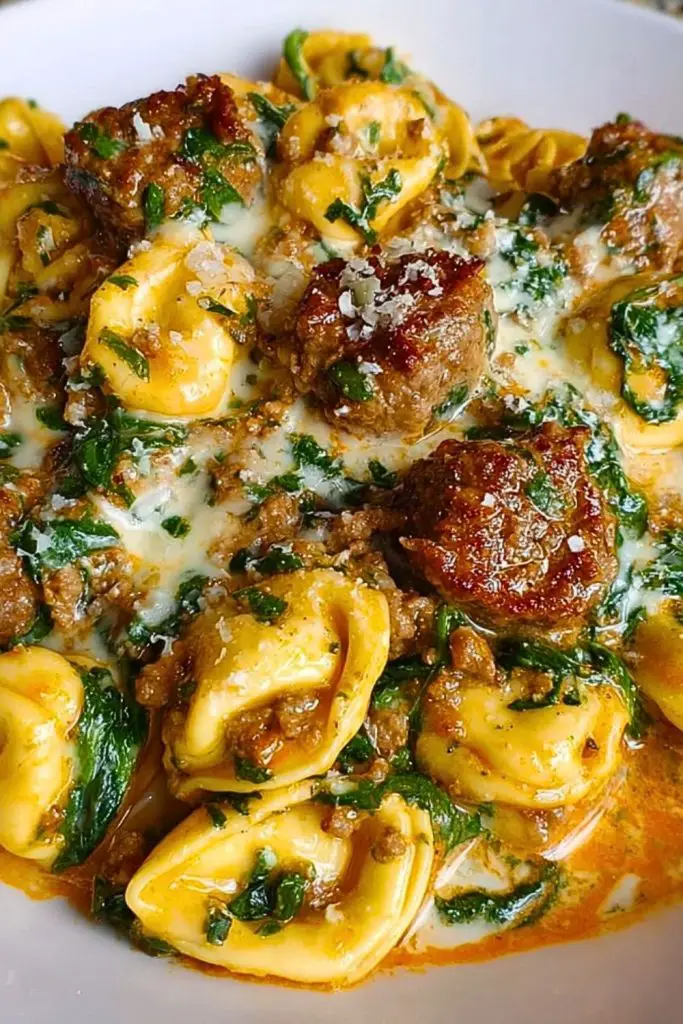 Creamy Garlic Butter Beef Tortellini with Italian Sausage & Spinach