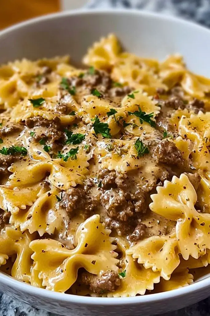 Short pastas like penne, rigatoni, or shells also do a great job of catching the sauce. Even fettuccine or spaghetti can work in a pinch, though they won’t give quite the same texture as the sturdy bite of bowties. Just avoid delicate shapes like angel hair—they won’t hold up as well with the beef and creamy sauce.