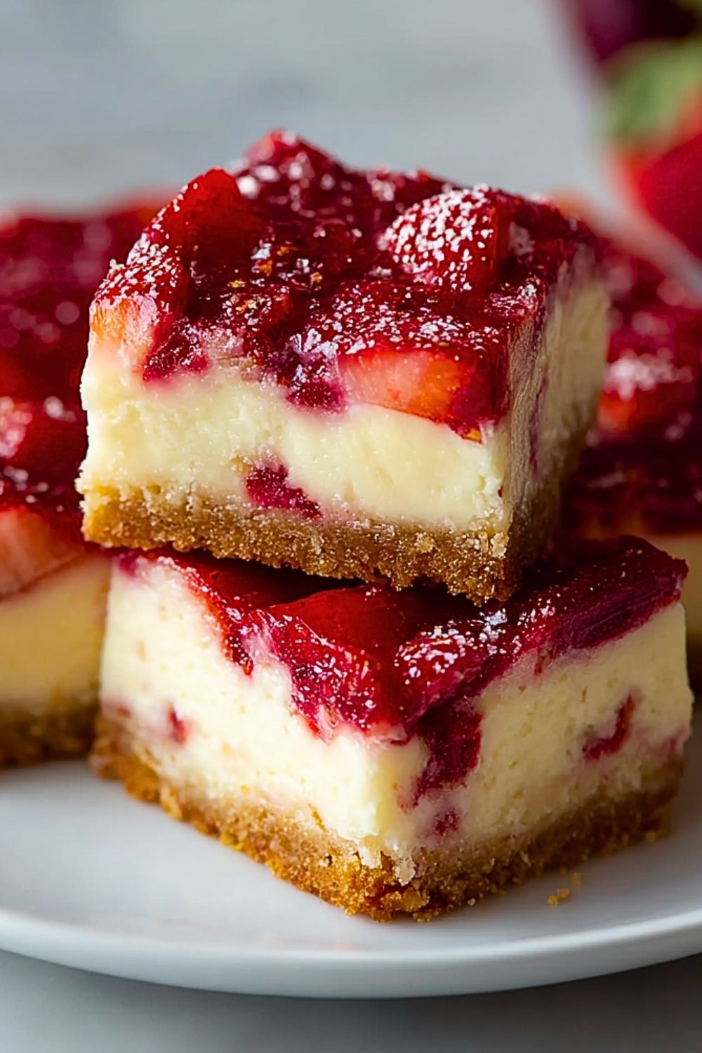 Let your cream cheese and eggs come to room temperature before mixing—this helps avoid a lumpy batter. When making the crust, press it firmly and evenly into the bottom of your pan to avoid crumbling after baking. For the strawberry topping, you can slightly macerate the strawberries with a keto-friendly sweetener to draw out their juices before swirling them into the cheesecake layer. Lastly, allow the bars to cool completely and chill for at least 2 hours before slicing—this helps them set perfectly for clean, neat cuts.
