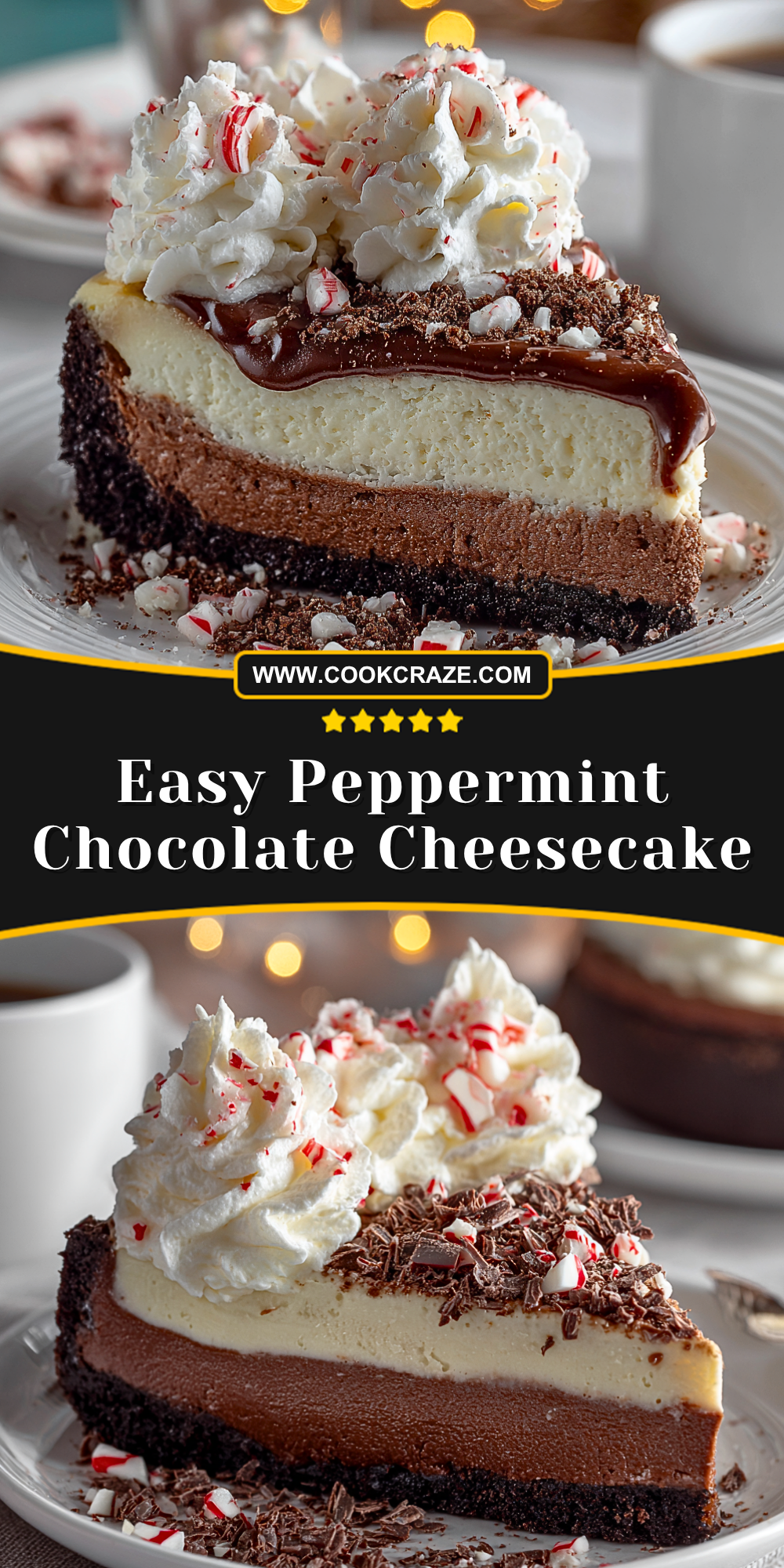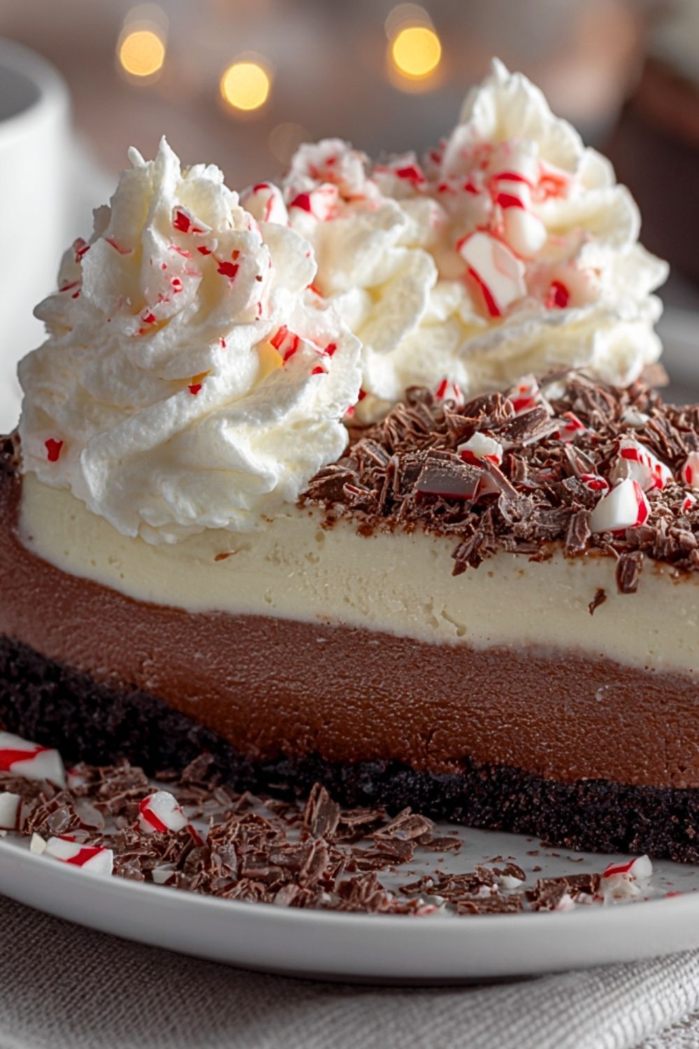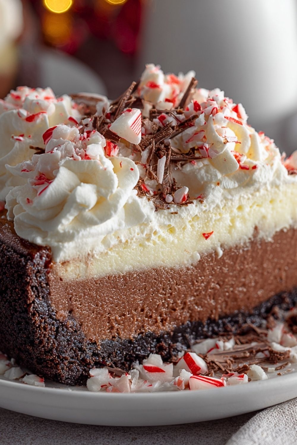 This Easy Peppermint Chocolate Cheesecake is a stunning holiday dessert made with a chocolate cookie crust, rich chocolate cheesecake layer, and a refreshing peppermint white chocolate mousse, all topped with fluffy whipped cream and crushed peppermint candies. Perfect for a Christmas party, winter potluck, or cozy night in, this easy recipe brings festive cheer to your table with minimal effort. It’s a showstopper make-ahead dessert that blends classic flavors of the season in every slice. Great for quick holiday baking, winter dessert ideas, or anyone looking for a creamy, peppermint twist on classic cheesecake.