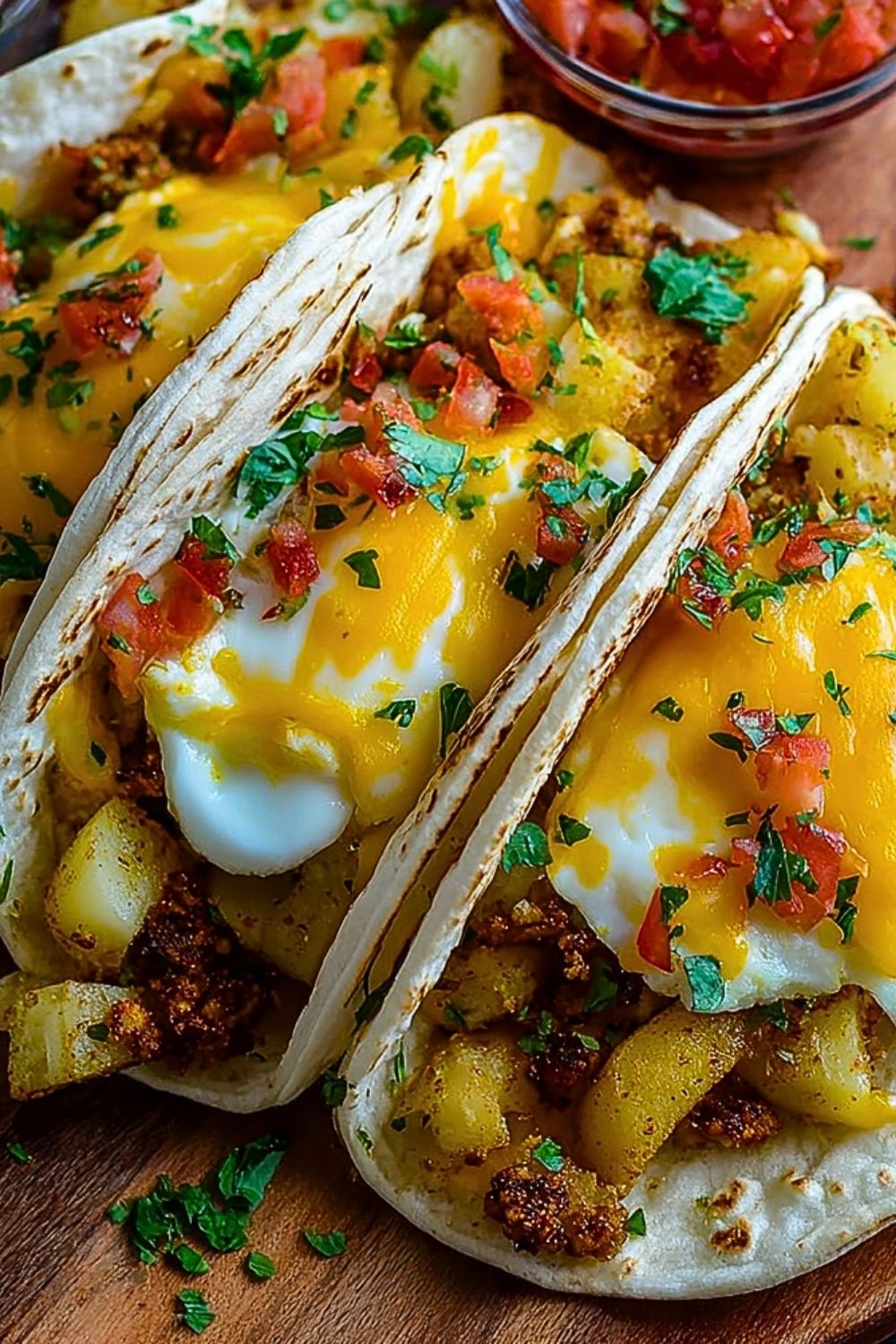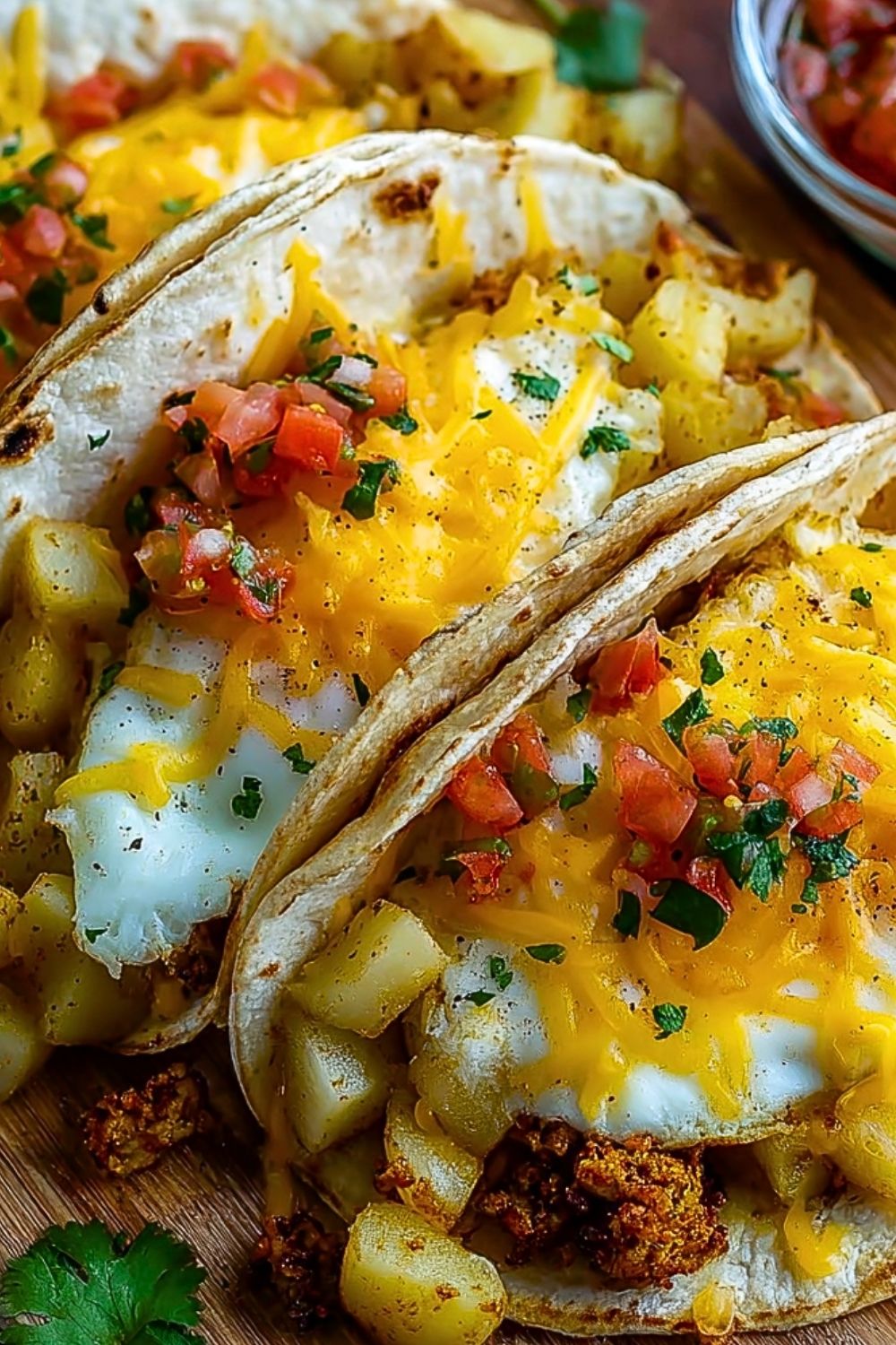 4. Assemble each taco by layering cooked potatoes, eggs, and shredded cheddar cheese. Optional: broil for 1–2 minutes to melt the cheese.