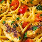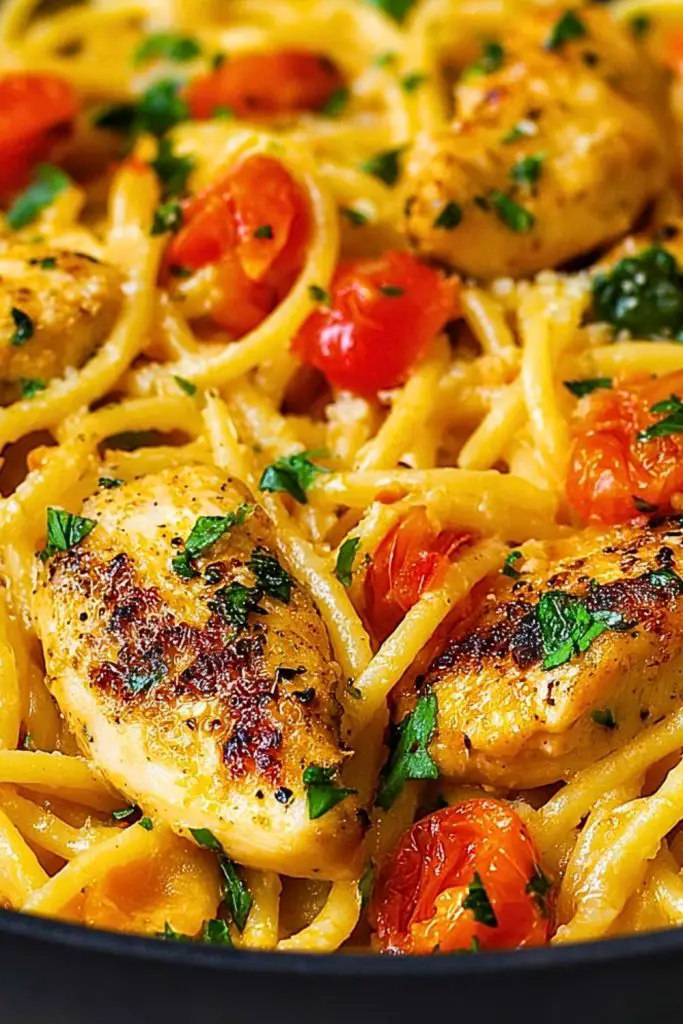 This garlicky saucy pasta is the definition of comfort food done right. With perfectly seared golden chicken breasts nestled into a creamy, garlic-infused sauce, this dish delivers big flavor with minimal effort. Tossed with al dente pasta and juicy tomatoes, it’s a crave-worthy meal that strikes the perfect balance between rich, savory, and fresh.
