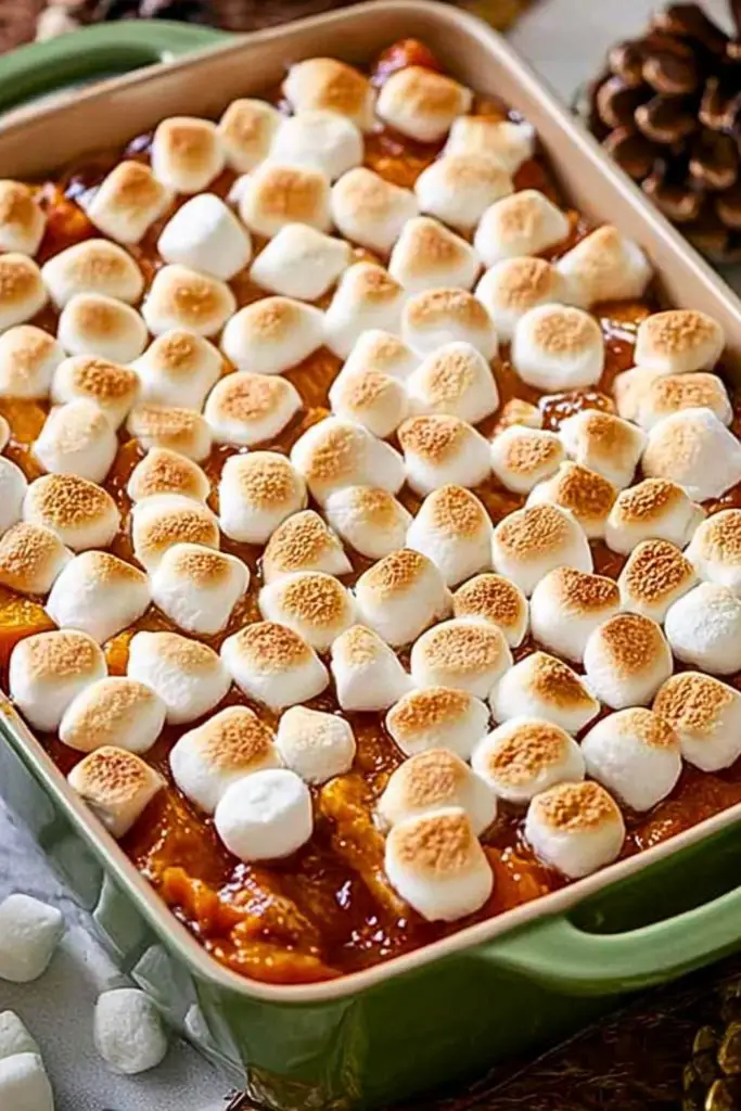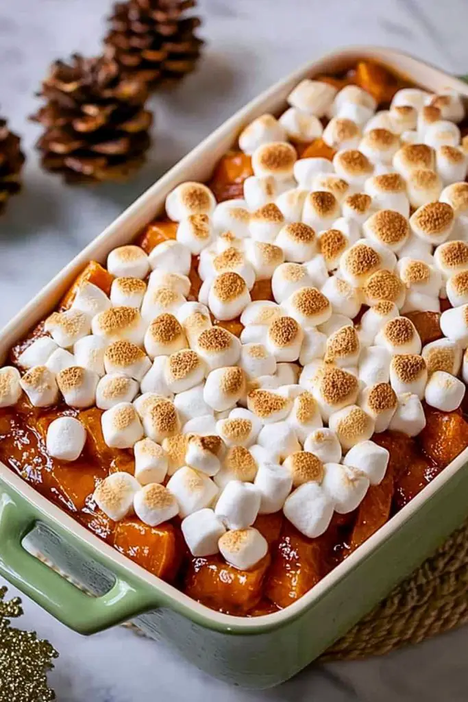 Keywords: sweet potato casserole, glazed sweet potatoes, marshmallow casserole, holiday side dish, easy recipe