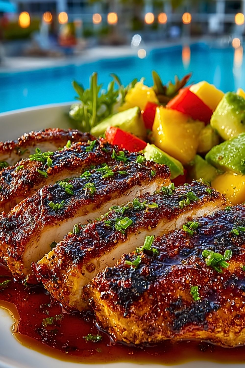 I slice the grilled chicken and arrange it on a serving plate. Then, I generously spoon the mango avocado mixture over the top, letting the juices mingle with the chicken.