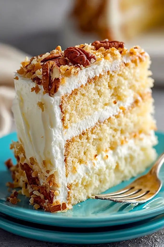Sprinkle the top of the frosted cake with the toasted pecans and coconut. Chill the cake for at least 30 minutes before slicing to allow the frosting to set. Serve at room temperature for best texture and flavor.