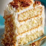 Sprinkle the top of the frosted cake with the toasted pecans and coconut. Chill the cake for at least 30 minutes before slicing to allow the frosting to set. Serve at room temperature for best texture and flavor.