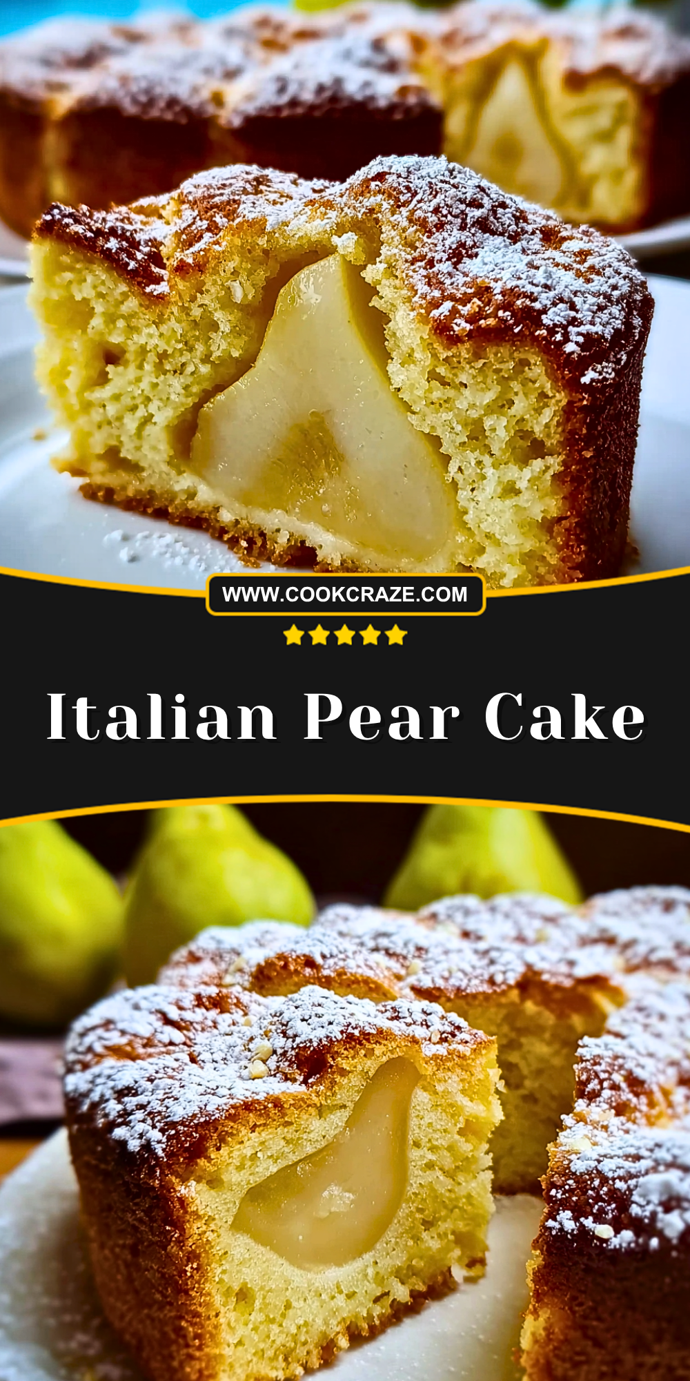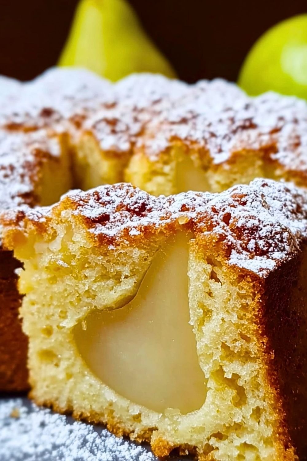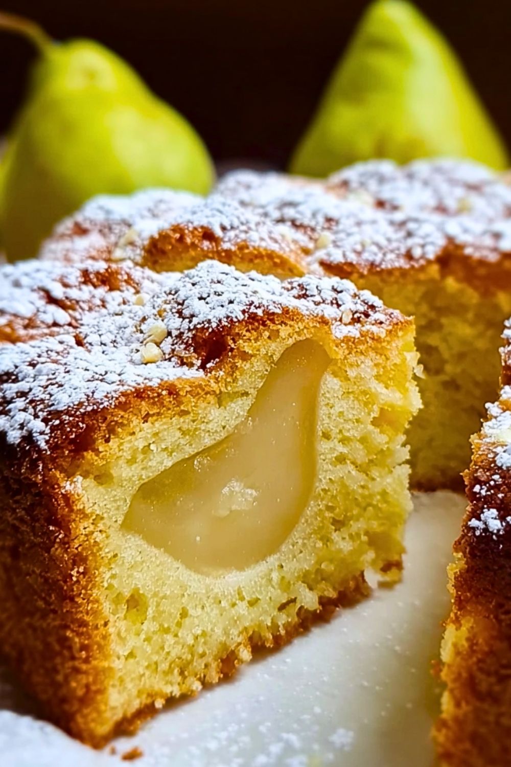Moist, tender, and delicately sweet, the Italian Pear Cake is a rustic dessert that captures the comforting essence of home-baked goodness. Bursting with the natural flavor of ripe pears and surrounded by a fluffy, buttery cake crumb, this classic treat is a celebration of simplicity and elegance. Each bite brings together the juiciness of baked fruit with the lightness of a sponge-like texture, all gently dusted with a snowy layer of powdered sugar.