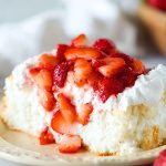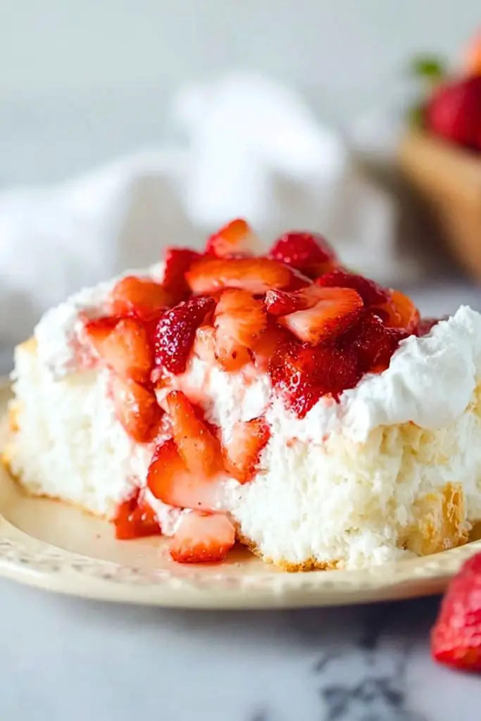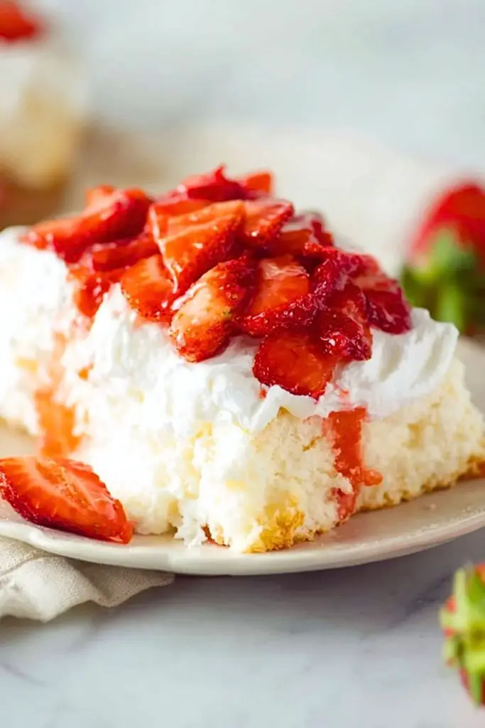 Keywords: angel food cake, strawberry dessert, low fat cake, easy summer dessert, dairy-free cake, light dessert, whipped cream, picnic dessert, breakfast ideas, healthy snack