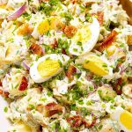 Cook Time: Boiling the potatoes takes around 10–12 minutes depending on the size of your cuts. Bacon will need about 8–10 minutes to crisp up. All in all, you can have this salad prepped and ready in just under 40 minutes, plus chilling time.