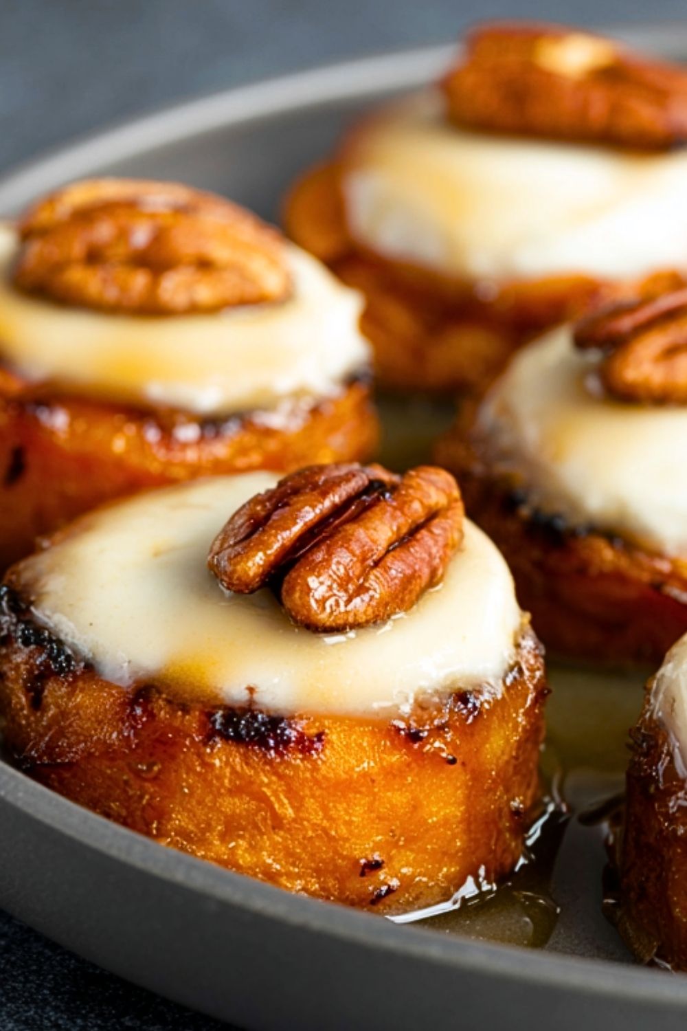 Remove from the oven and immediately press a pecan half onto each toasted marshmallow while they’re still warm and sticky. Let cool for 2–3 minutes before transferring to a serving platter.