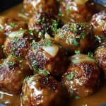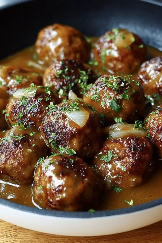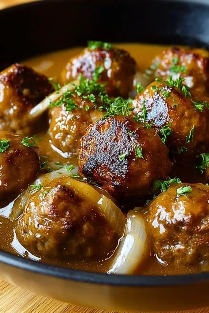 These meatballs are juicy, well-seasoned, and perfectly browned for a little crust before bathing in a silky, flavorful gravy that clings to every bite. The gravy isn’t overly complicated—it’s built on the good stuff: pan drippings, onions, beef stock, and just the right touch of seasoning. This dish comes together beautifully in a single pan, making cleanup almost as satisfying as the first bite.
