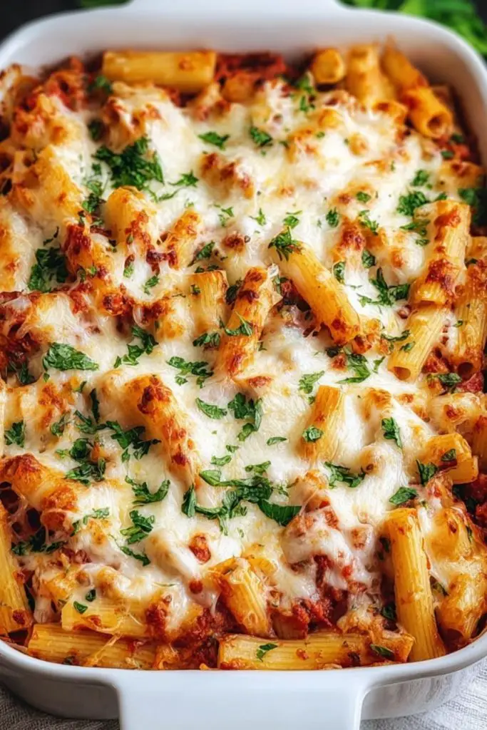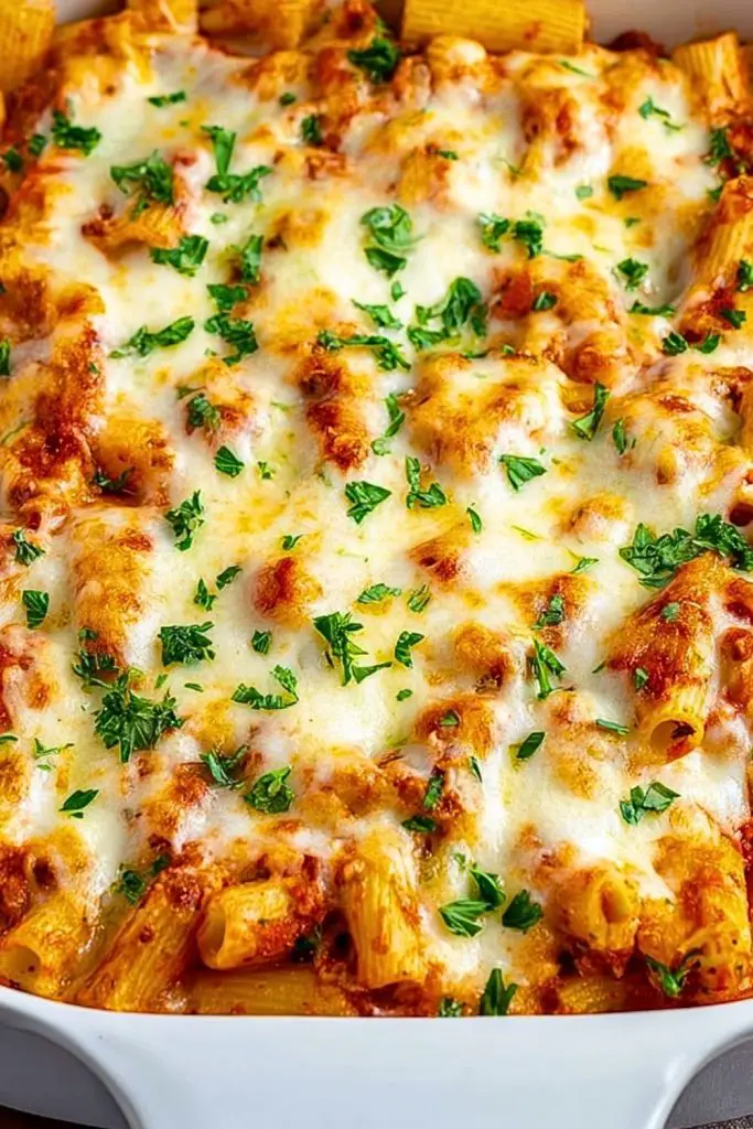 Remove the baked ziti from the oven and let it sit for at least 10 minutes before serving. This resting period allows the layers to firm up slightly, making it easier to serve neat, satisfying portions.