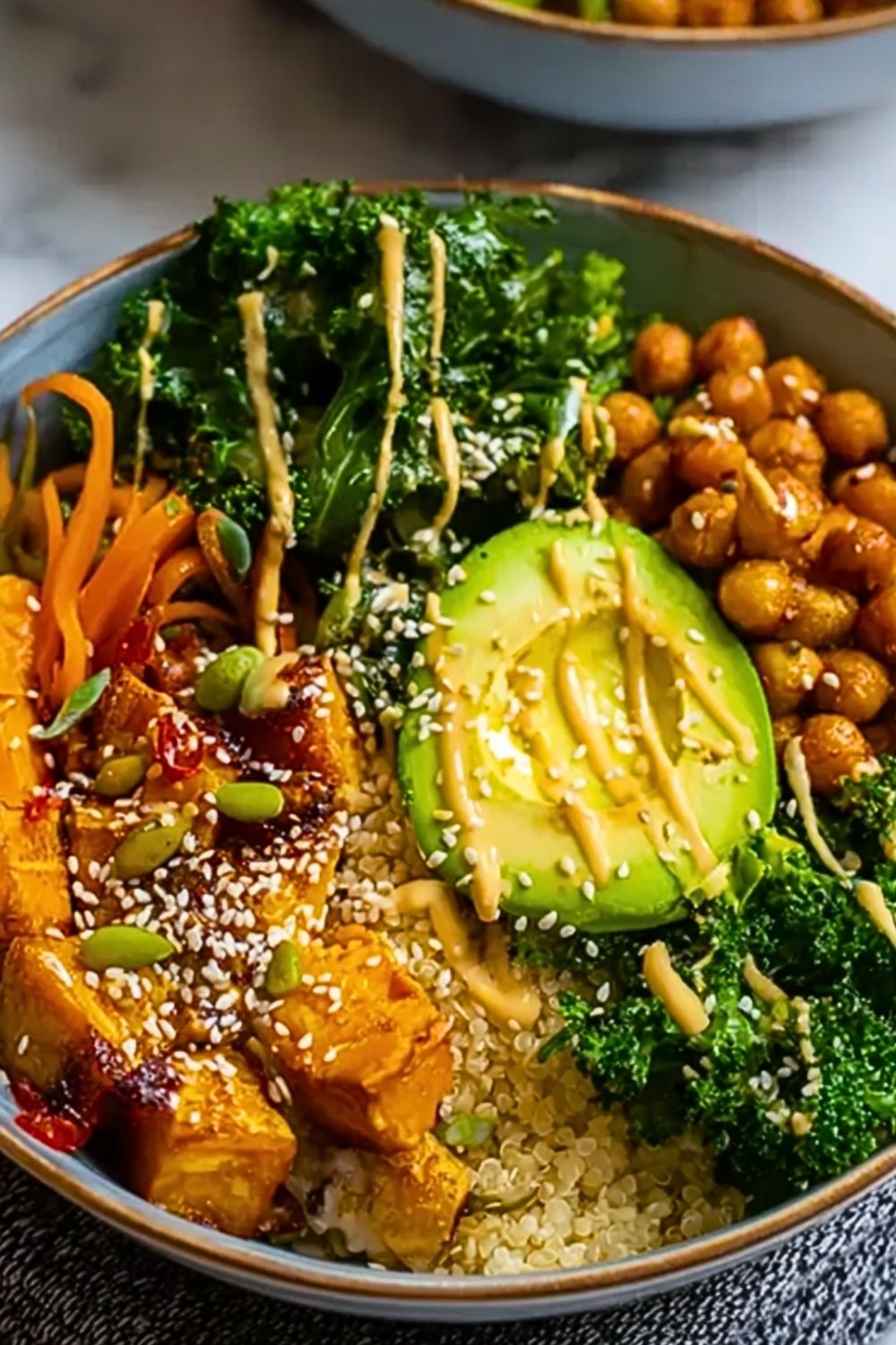 Start with a base of quinoa, then arrange the roasted sweet potatoes, chickpeas, broccoli, kale, carrots, and avocado in sections around the bowl for a visually appealing presentation.
