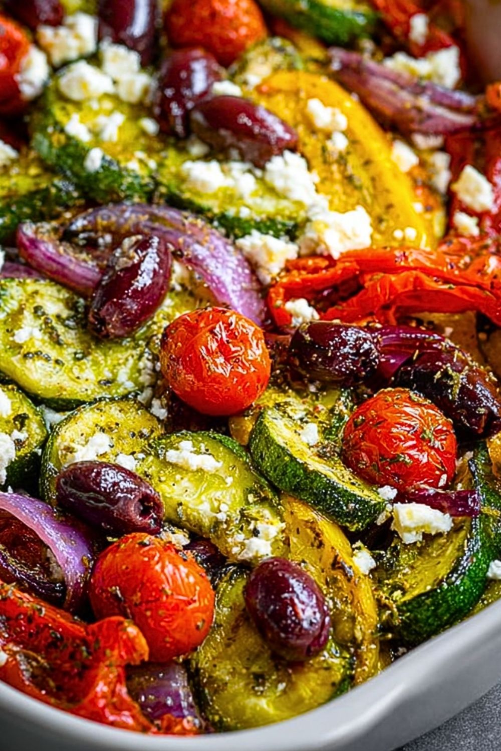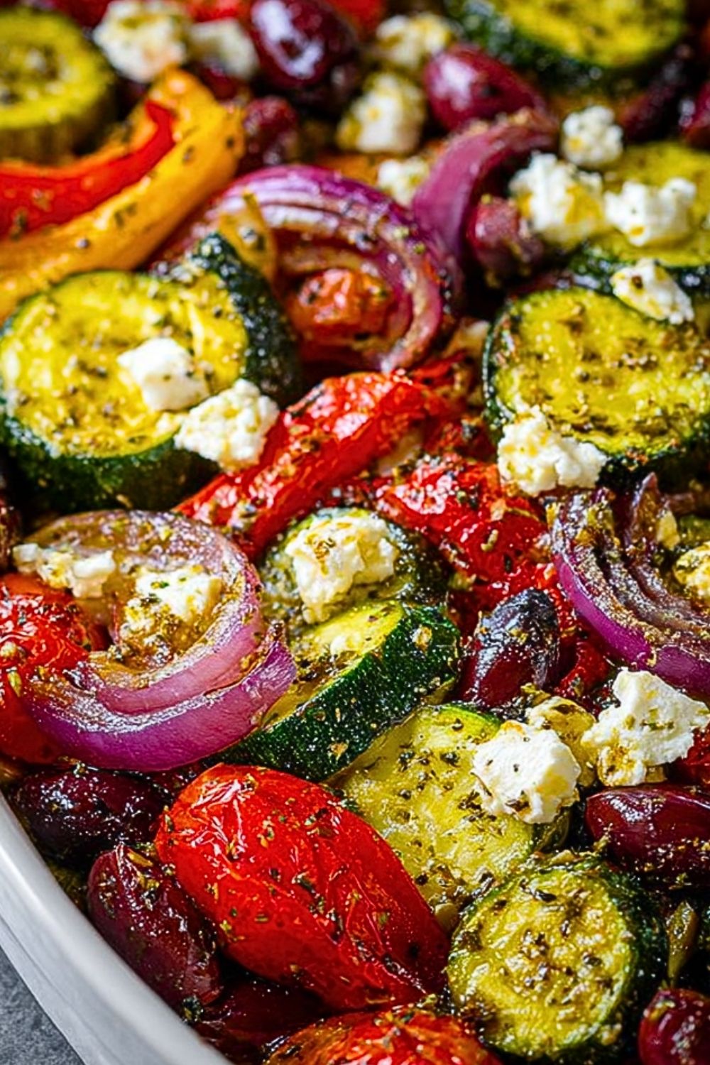 Cut the vegetables into similar-sized pieces to ensure even roasting and avoid undercooked or overly soft textures. Don’t overcrowd the pan, as spacing allows the vegetables to caramelize instead of becoming soggy. Use high-quality olive oil and dried herbs for the most authentic flavor, and add the feta cheese toward the end of roasting so it softens without completely melting. A final squeeze of fresh lemon juice just before serving can brighten all the flavors beautifully.
