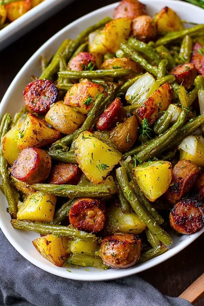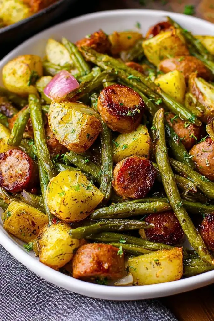 One of the best things about this recipe is how flexible it is. Don’t have green beans? Try broccoli or asparagus. No baby potatoes? Yukon gold or even sweet potatoes will do the trick. If you’re avoiding meat, swap the sausage with plant-based links or roasted mushrooms for a vegetarian twist. You can also play around with seasonings—add garlic powder, paprika, or even a dash of balsamic vinegar for extra depth.