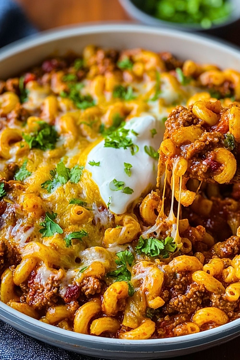 Top with extra shredded cheese, a dollop of sour cream, and sprinkle freshly chopped cilantro or parsley on top. Add any of your favorite toppings like green onions or jalapeños for a flavor boost. Serve hot and enjoy this one-pot comfort meal straight from the pan.