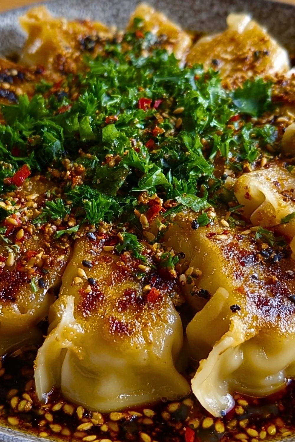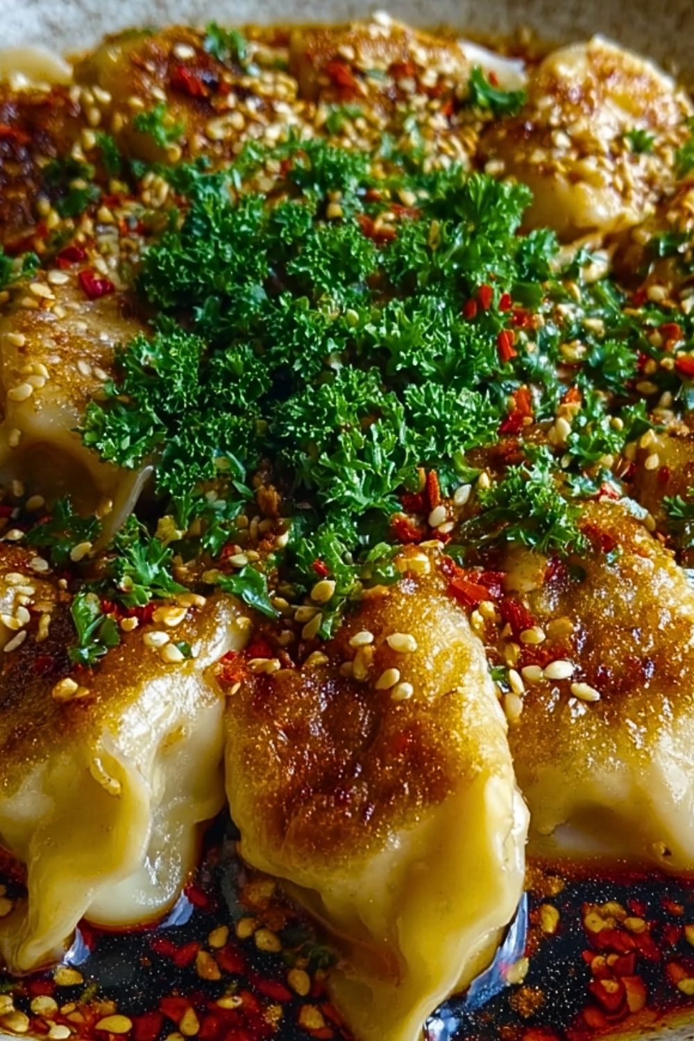 Finish the dish by sprinkling toasted sesame seeds, chopped herbs, and green onions over the top. Add extra chili flakes if you like a bit more heat. Serve immediately while the dumplings are hot and crispy for the best experience.