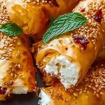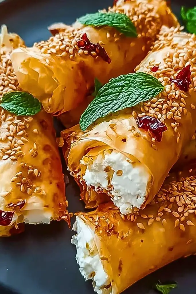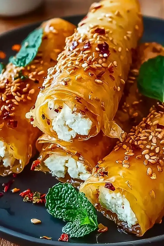 When working with phyllo dough, always keep it covered with a slightly damp towel while you assemble the rolls to prevent it from drying out. Use good-quality feta for maximum creaminess and flavor; a mix of creamy feta and a touch of cream cheese can make the filling extra luscious. Don’t overstuff the rolls — a modest amount of filling keeps the structure tight and crisp. Finally, be generous with the sesame seed topping and chili flakes for that crave-worthy finish. Let the rolls cool slightly before drizzling with chili honey so the glaze stays vibrant and doesn’t soak in too quickly.