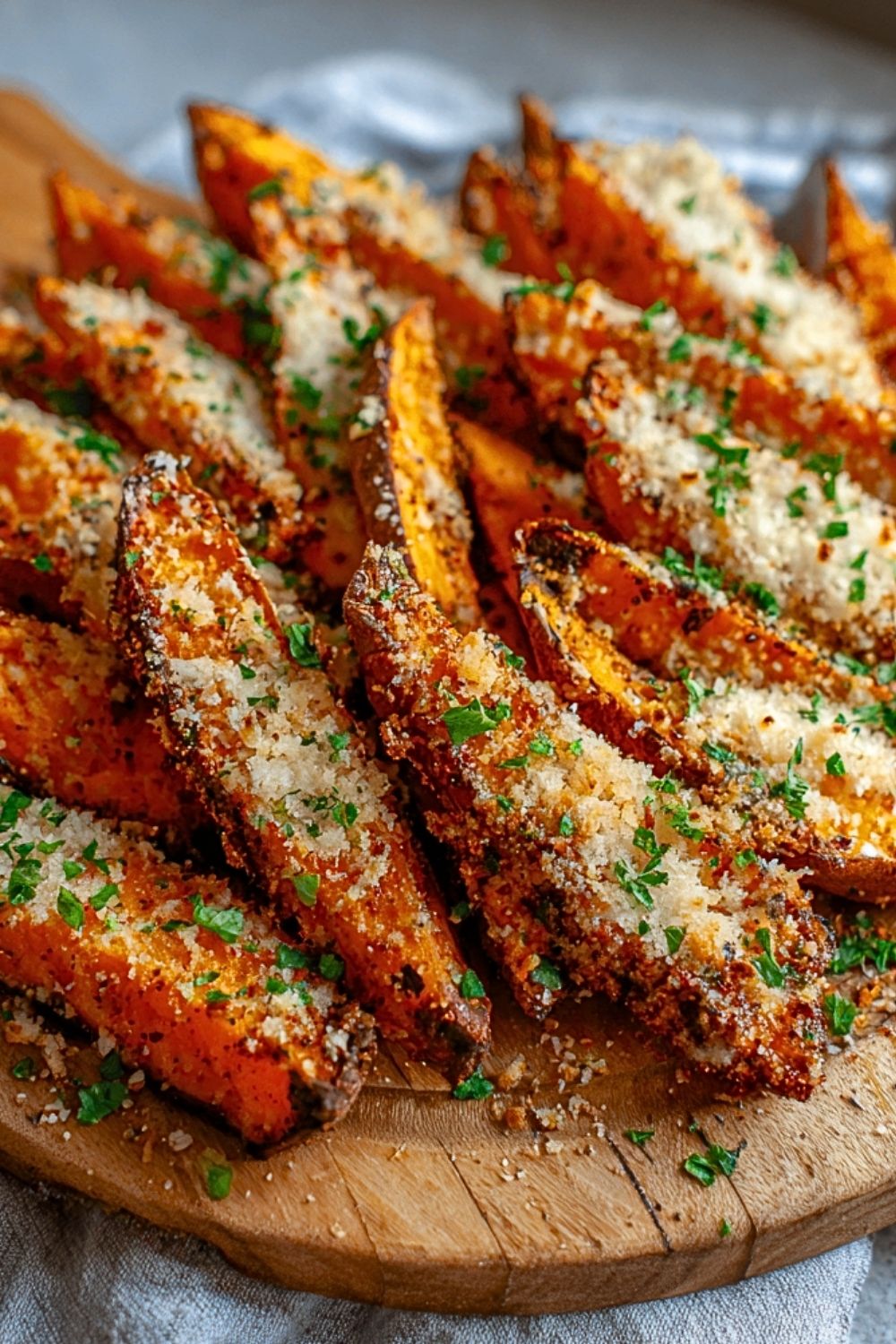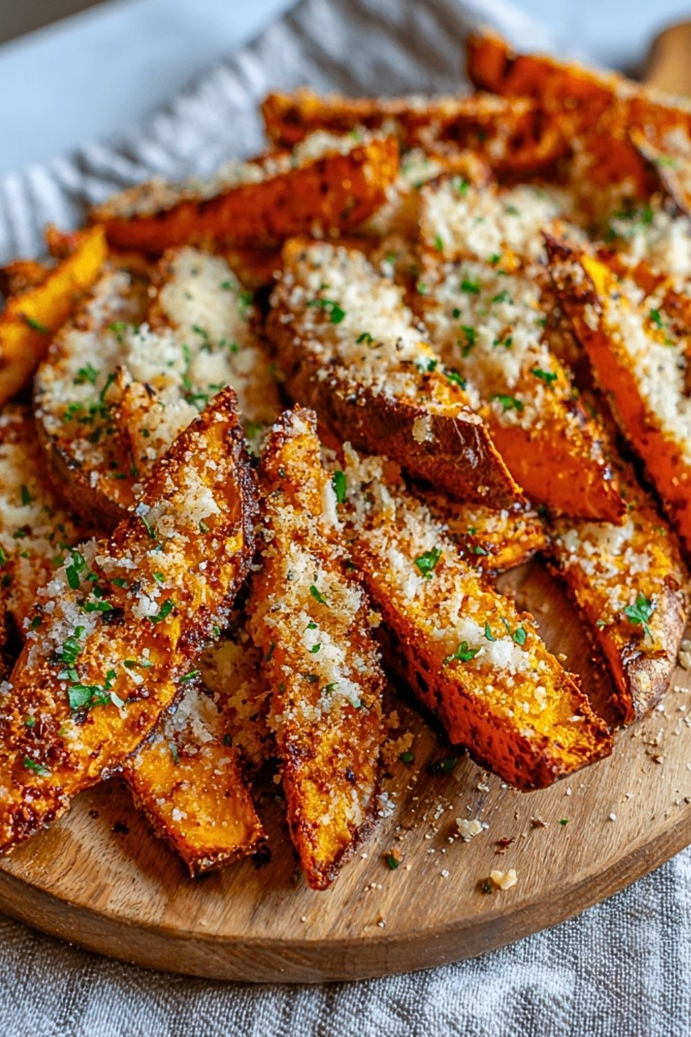 Parmesan Garlic Sweet Potato Fries are best enjoyed fresh out of the oven when their texture is at its peak—crisp on the outside and tender on the inside. For the most even crisp, ensure your wedges are spaced out on the baking sheet and not overlapping. Using freshly grated Parmesan will give a richer, meltier finish compared to pre-packaged cheese. This recipe can be easily doubled, but use two baking sheets to avoid overcrowding.