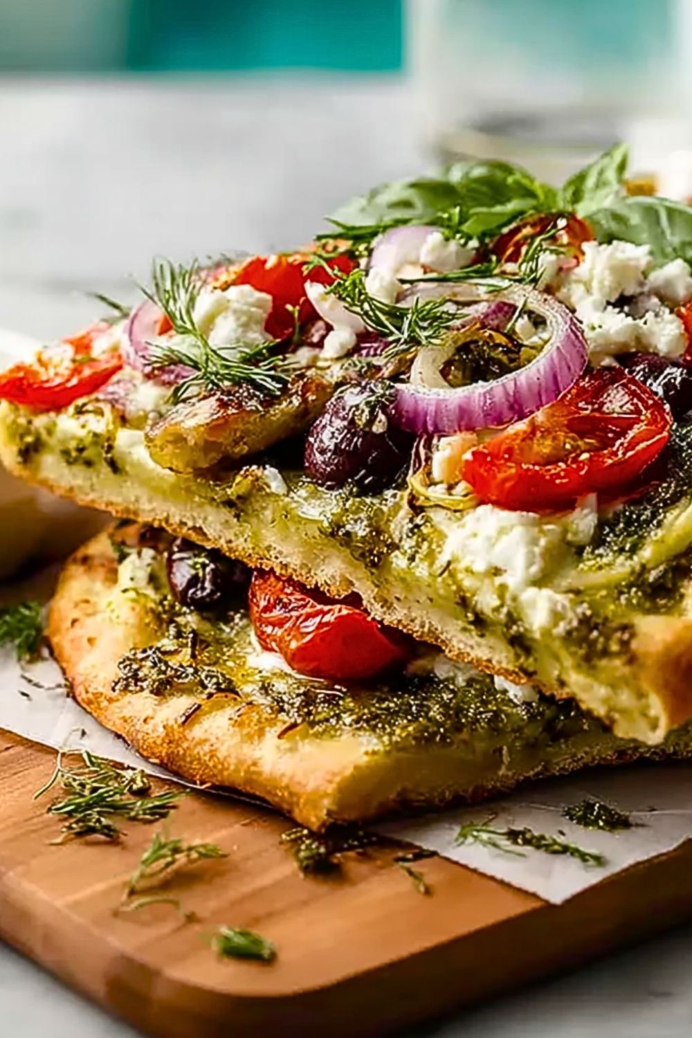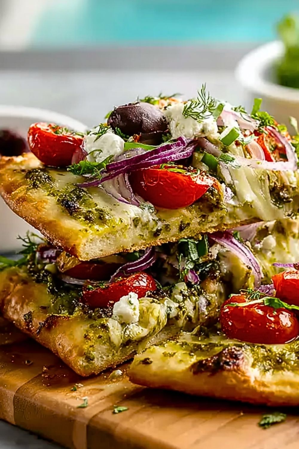 Crispy, cheesy, and loaded with vibrant Mediterranean flavors, this Pesto Mediterranean Flatbread Pizza is a quick dinner or healthy snack you’ll crave on repeat. With a base of herby basil pesto, gooey mozzarella, juicy tomatoes, briny olives, and tender zucchini, it’s an easy recipe perfect for busy nights or weekend food ideas. Whether you’re searching for quick lunch inspiration, easy dinner recipes, or Mediterranean twists on pizza night—this one’s a must-try.