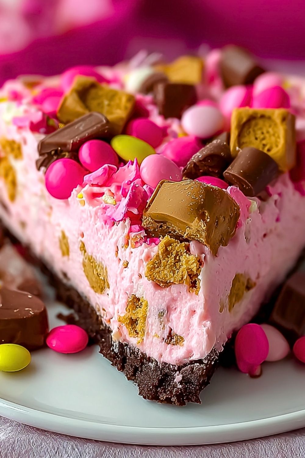 Perfect for Valentine’s Day, birthdays, or any celebration that calls for a bit of whimsy, this vibrant dessert doesn’t just taste amazing—it’s a showstopper on the table. It delivers that wow factor with its bold colors and candy-studded top, but it’s surprisingly simple to put together. No oven needed, just a love for sweets and a fridge to chill it.