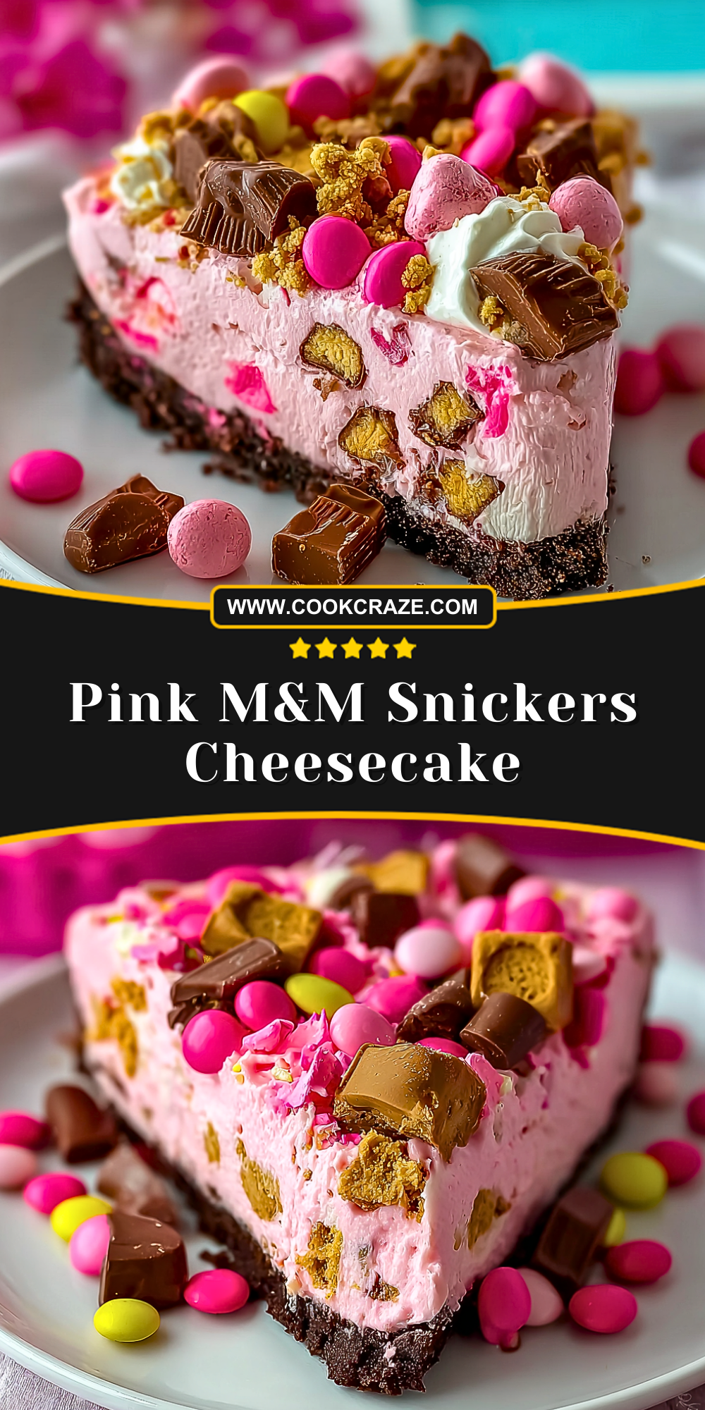 Keywords: pink m&m cheesecake, snickers cheesecake, no bake cheesecake recipe, candy cheesecake, easy dessert recipe, party dessert ideas, valentines cheesecake