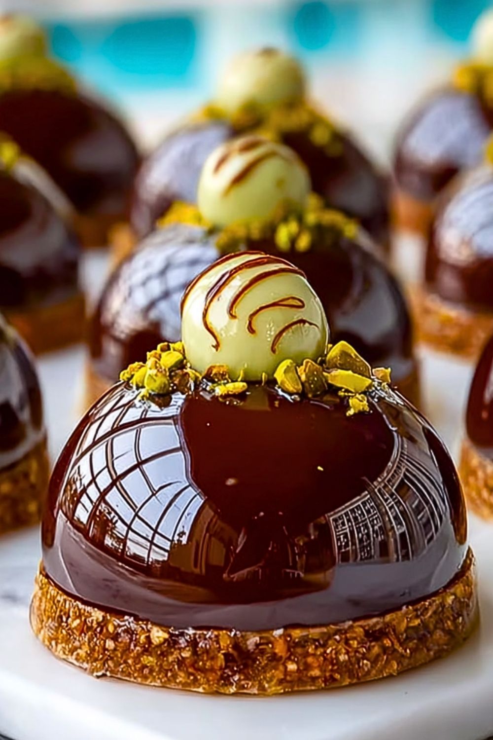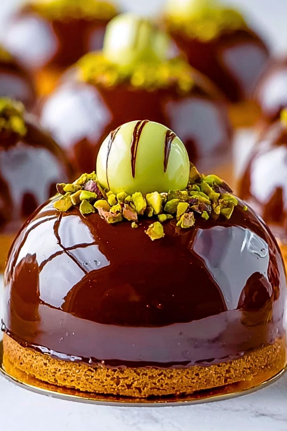 Unmold the frozen entremets and place on a wire rack. Pour the glaze smoothly over each dome. Let excess drip off. Decorate with chopped pistachios or edible gold leaf. Chill for 2–3 hours to allow the glaze to set and the mousse to thaw slightly.