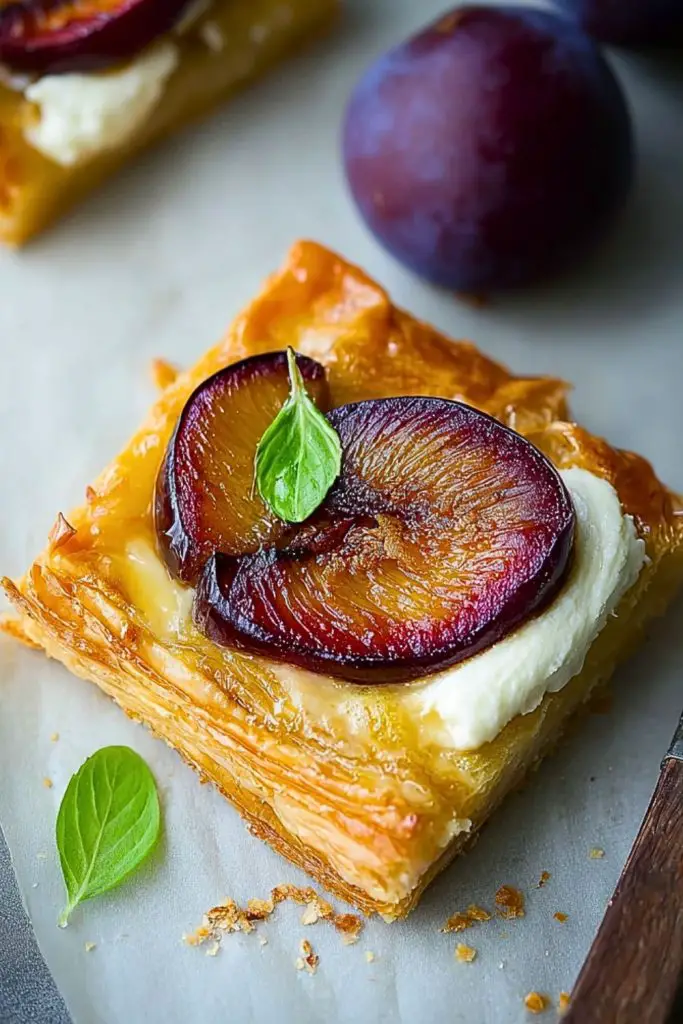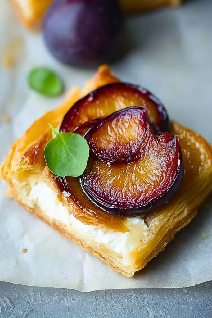 You can easily customize this recipe by swapping out the fruit or cheese. Try figs, peaches, or berries in place of plums, or experiment with mascarpone, goat cheese, or a hint of blue cheese for a more savory twist. These tarts are best served the same day but can be prepped in advance for convenience. If using homemade puff pastry, ensure it’s well-chilled before baking for optimal puff.